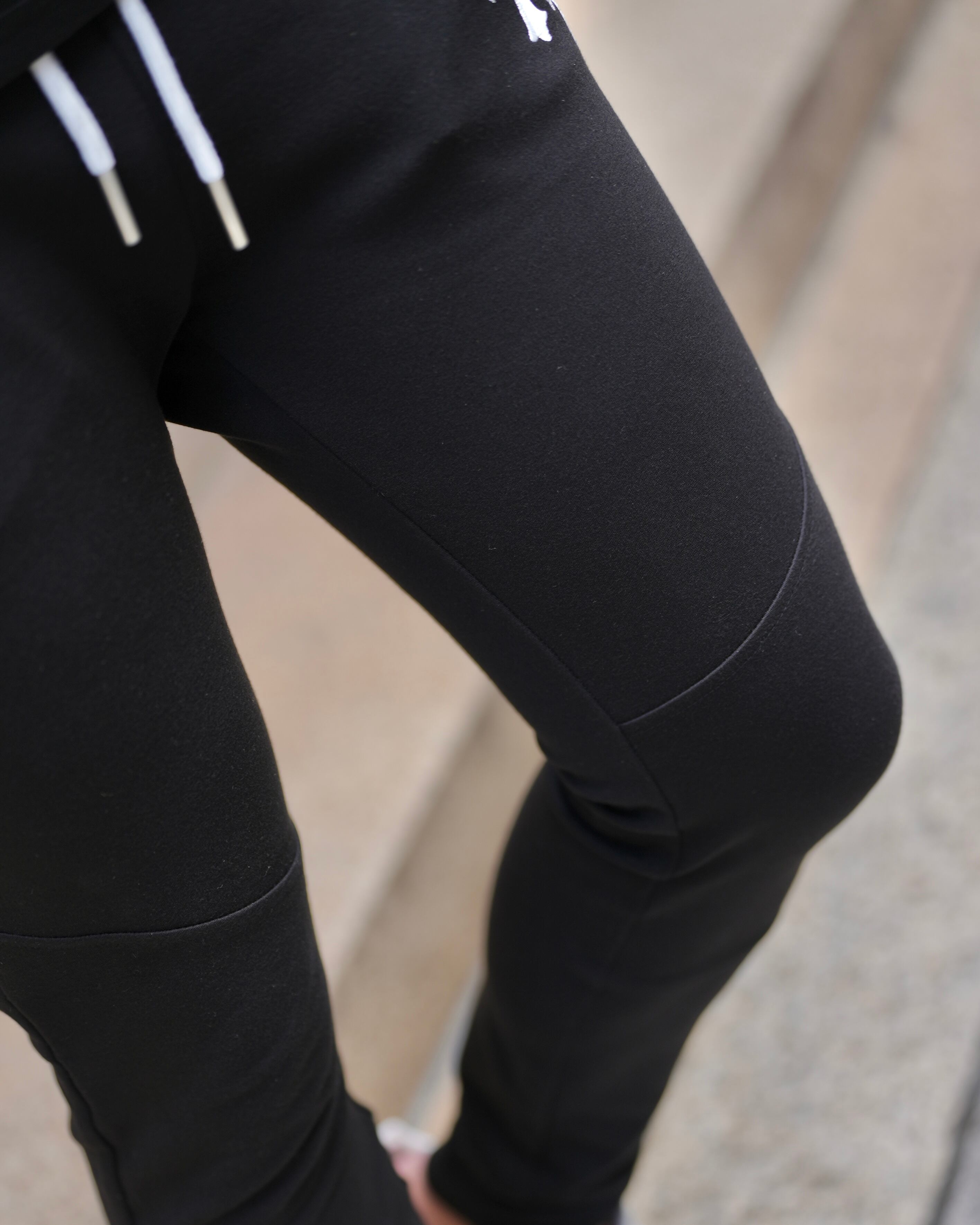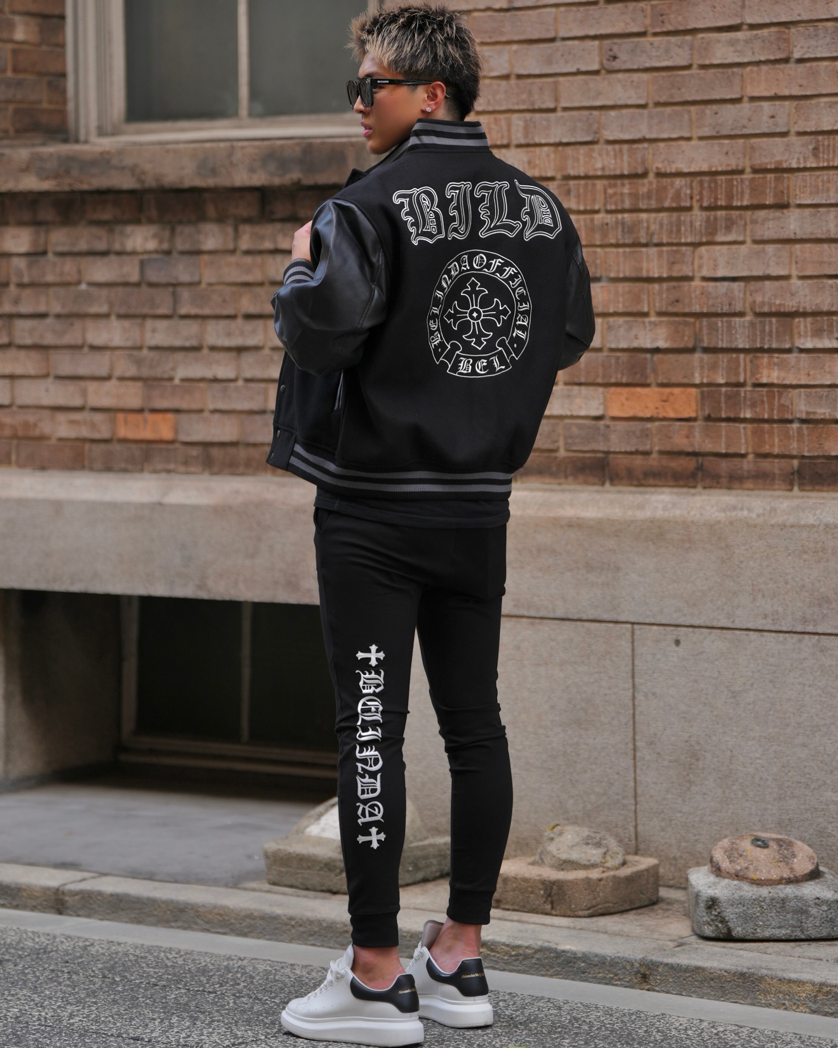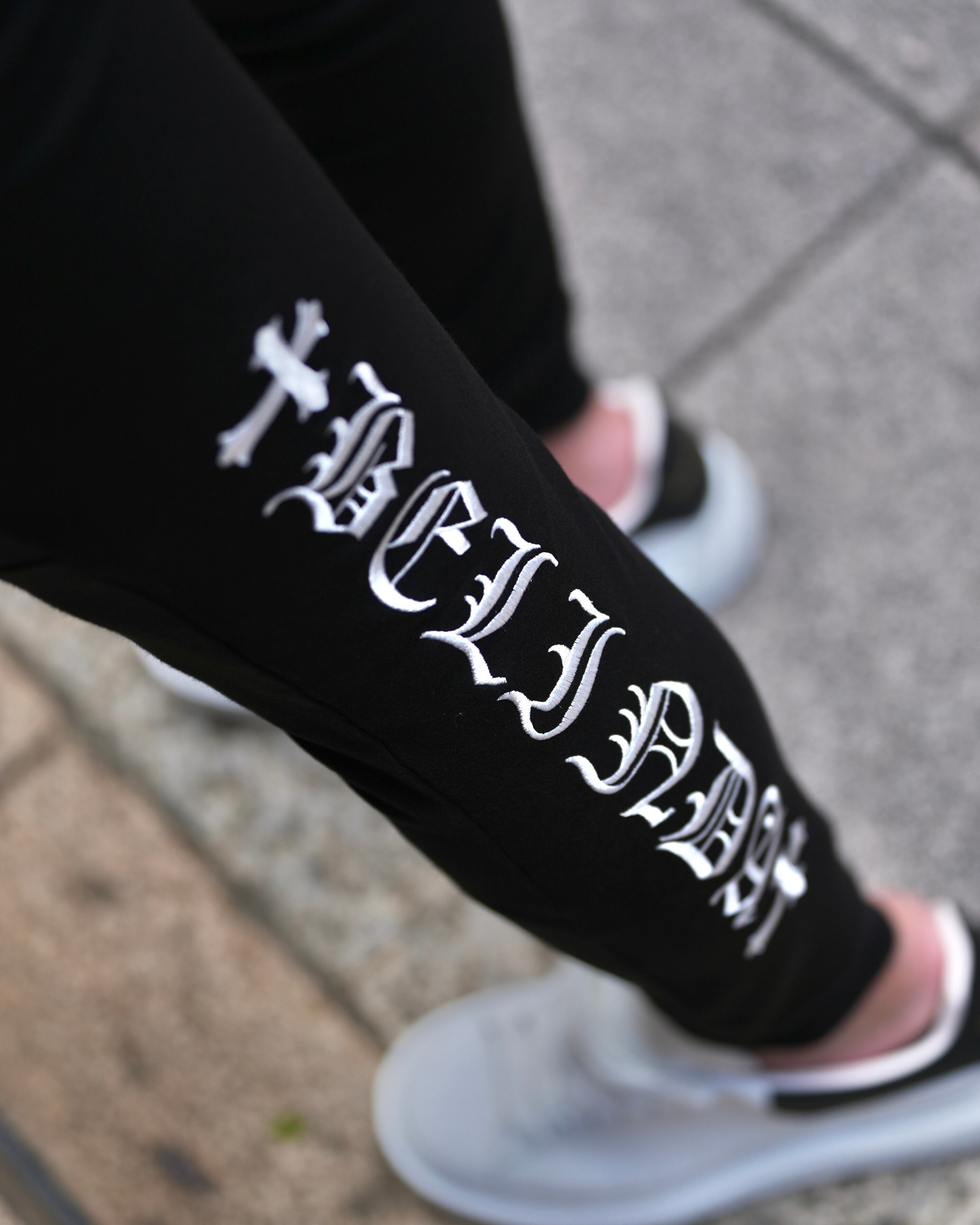 映えるクロス刺繍と、ふくらはぎに入った刺繍のBELINDAロゴが存在感を放つジョガーパンツ。