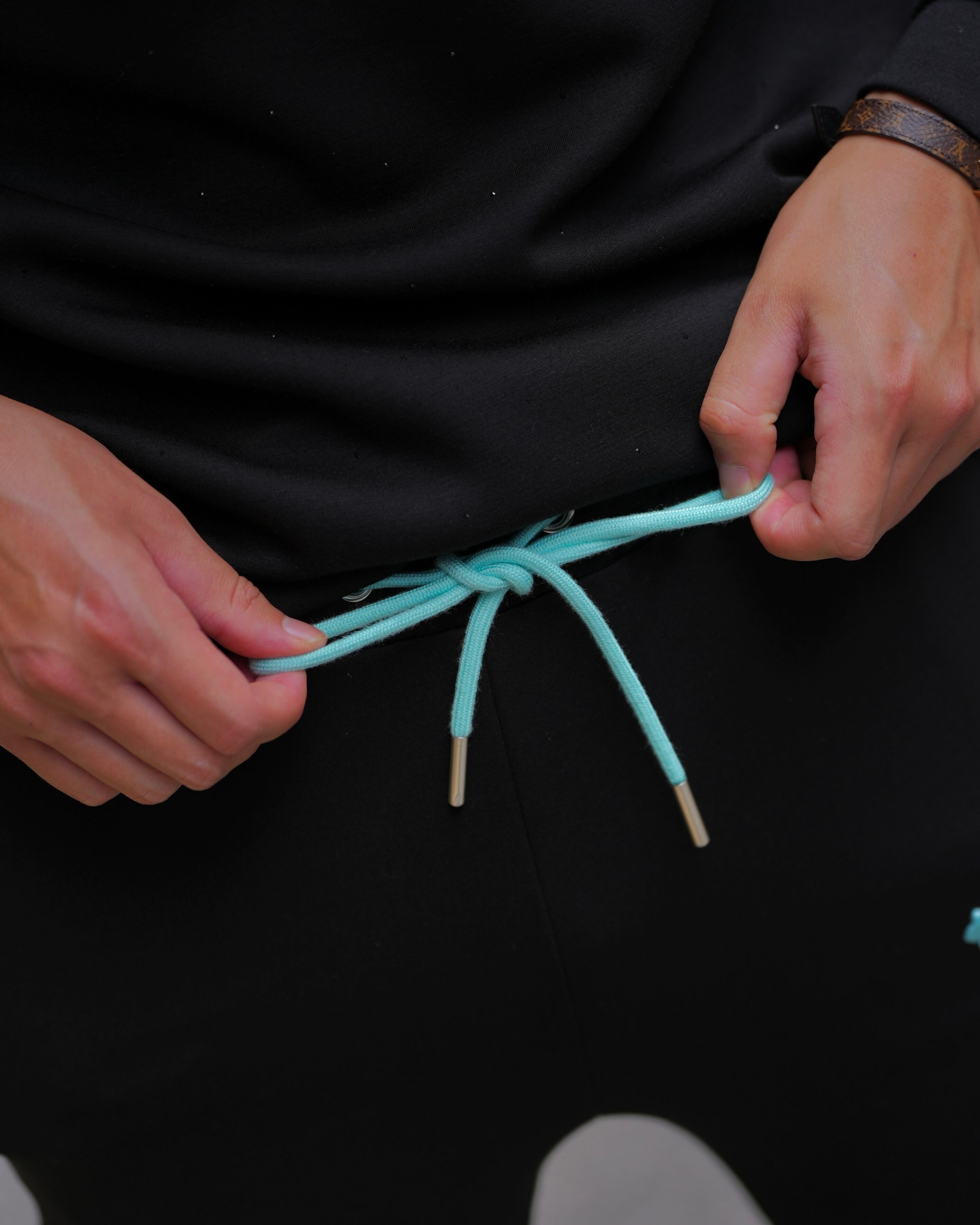 鮮やかなターコイズブルーの刺繍が、ブラックボディに鮮烈なアクセントを加える。