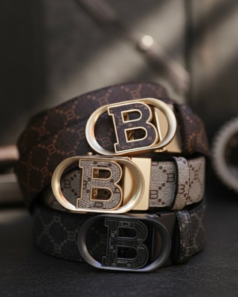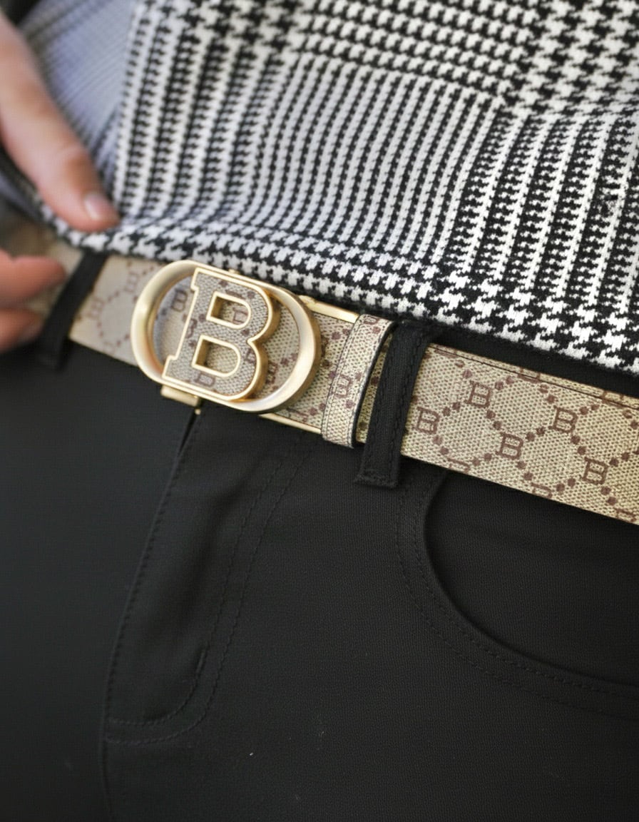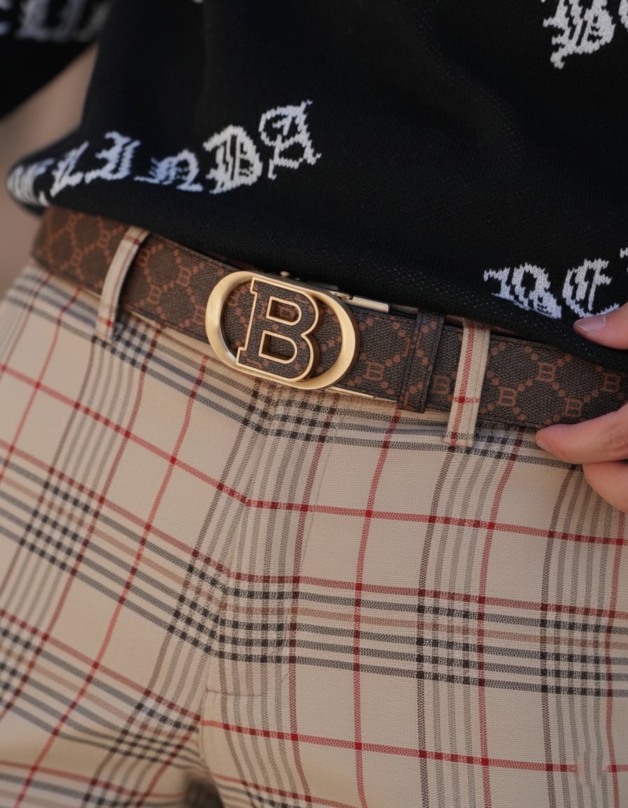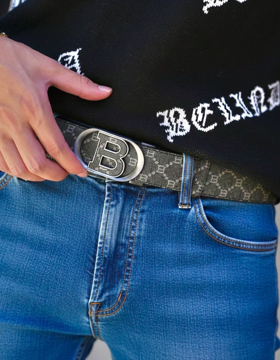 ブランドを象徴する「B」バックルは圧倒的な存在感を放ち、腰元から全体のコーデを格上げ。