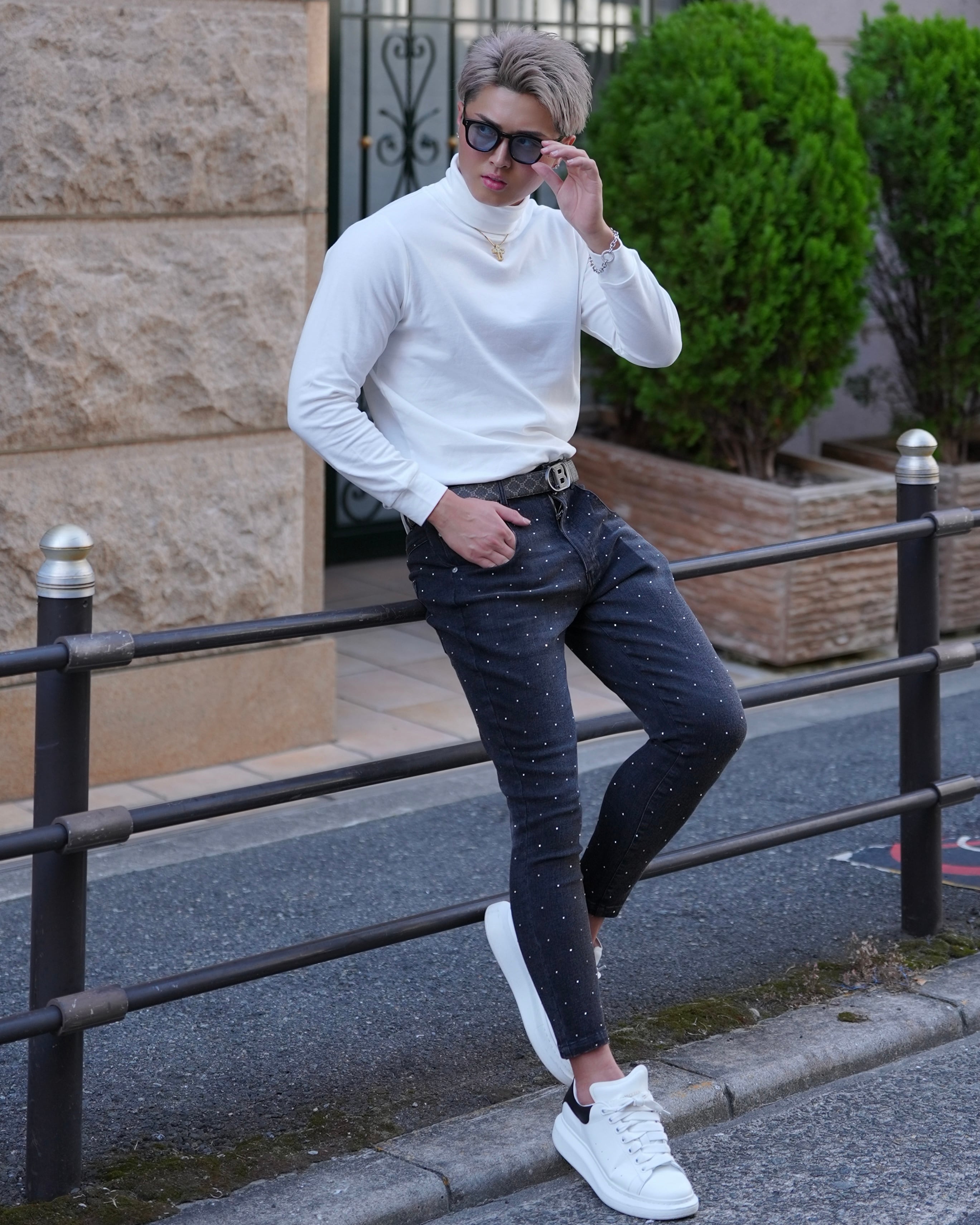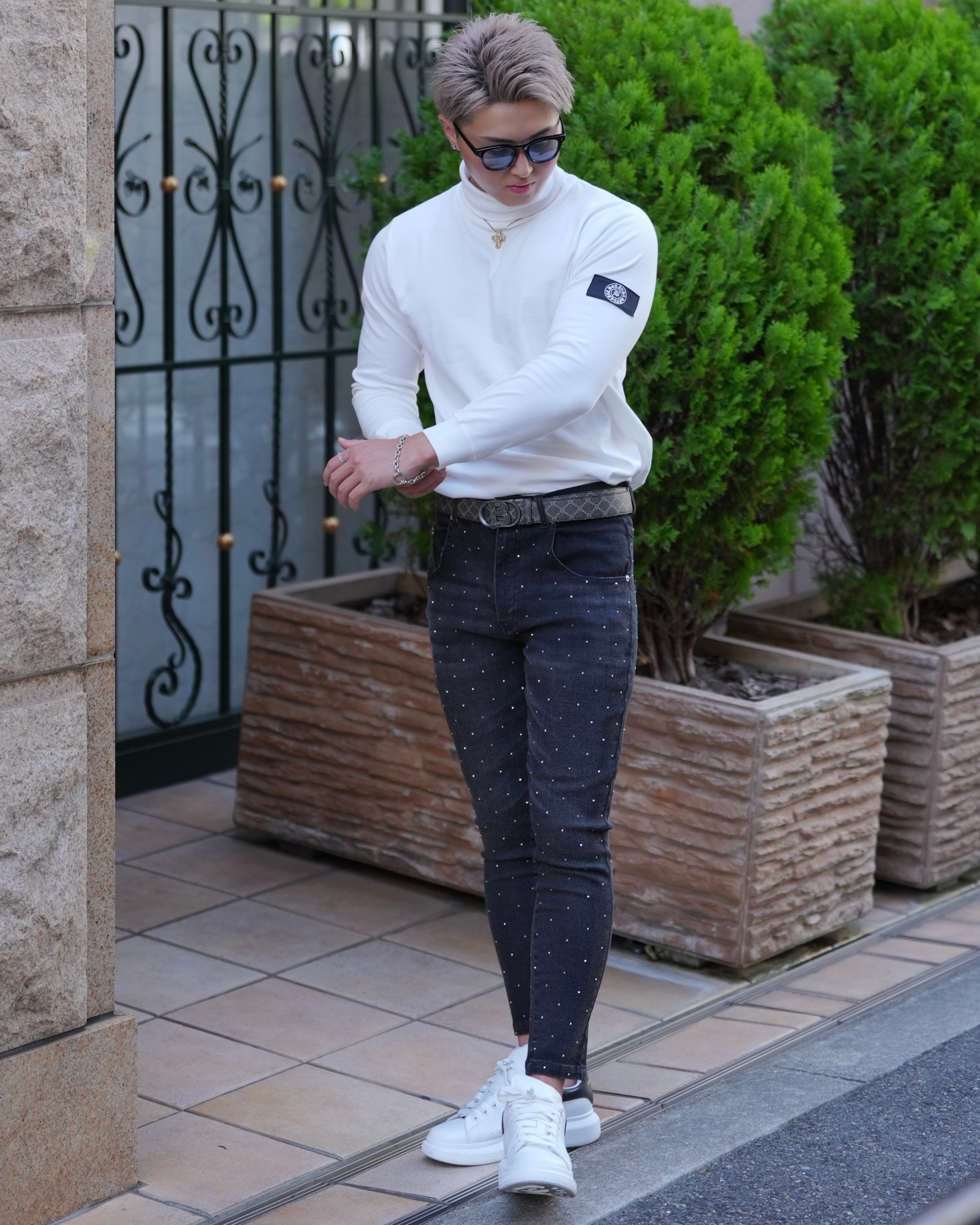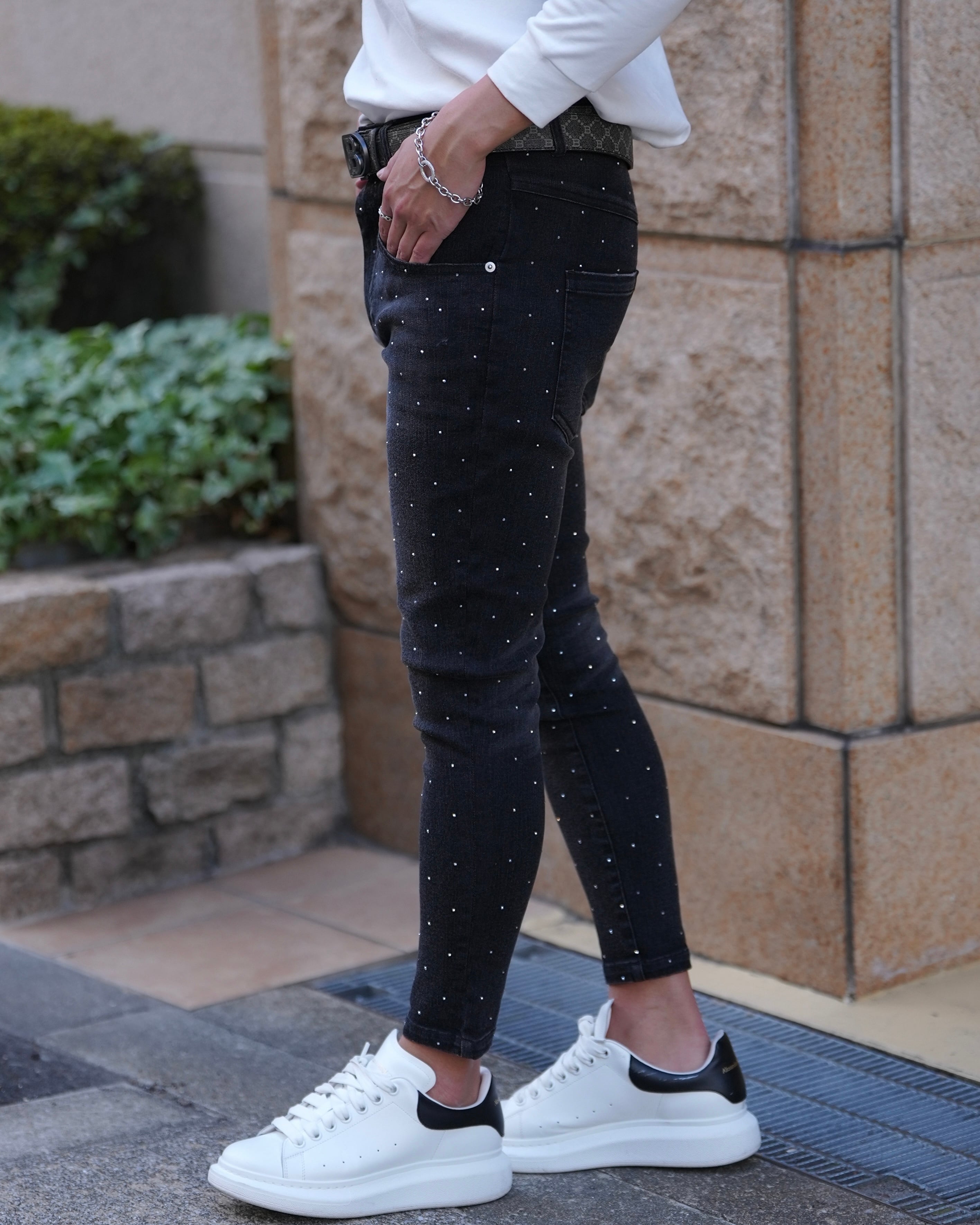タイトなシルエットに無数のラインストーンを散りばめ、歩くたびに光を反射する最強の一本。