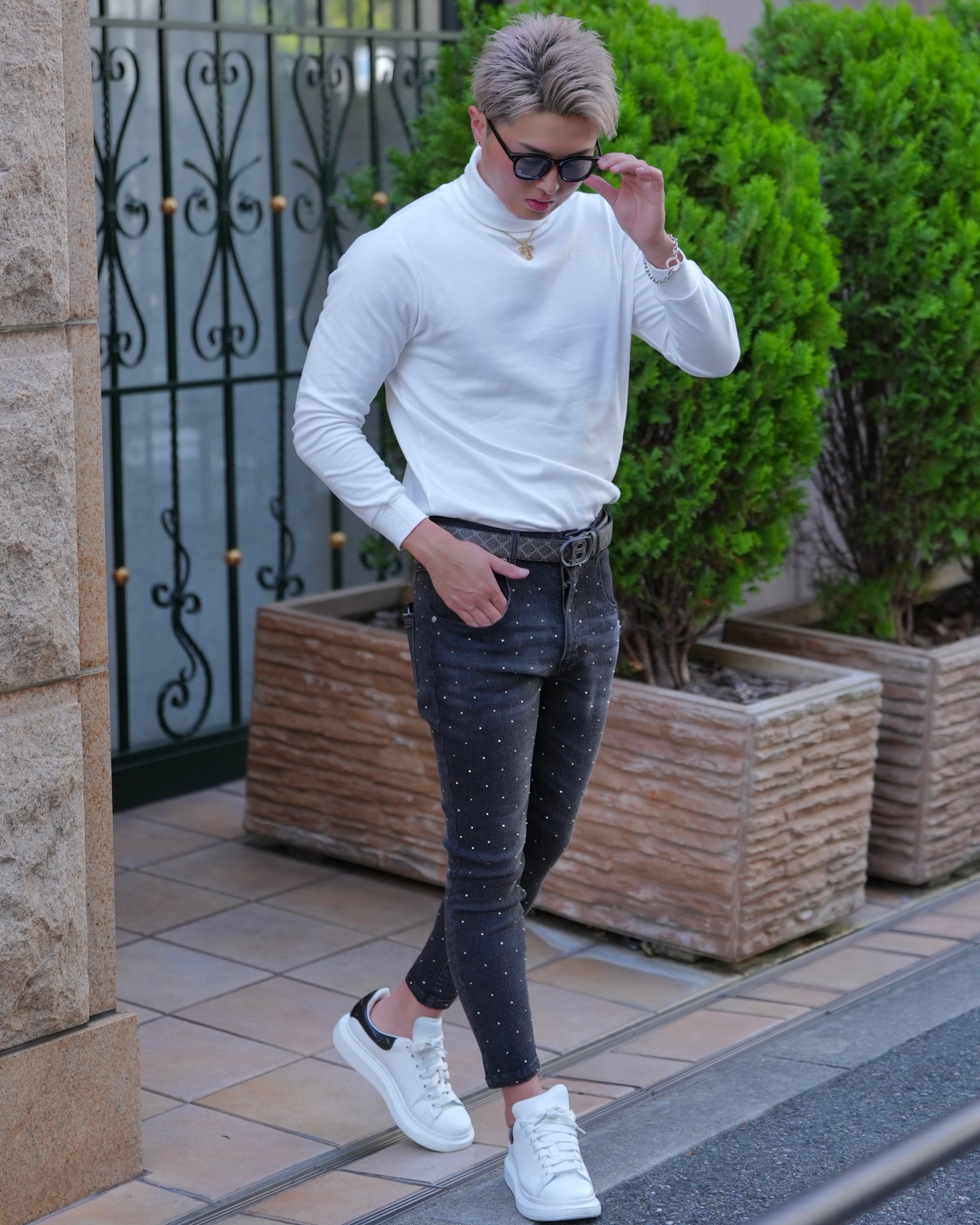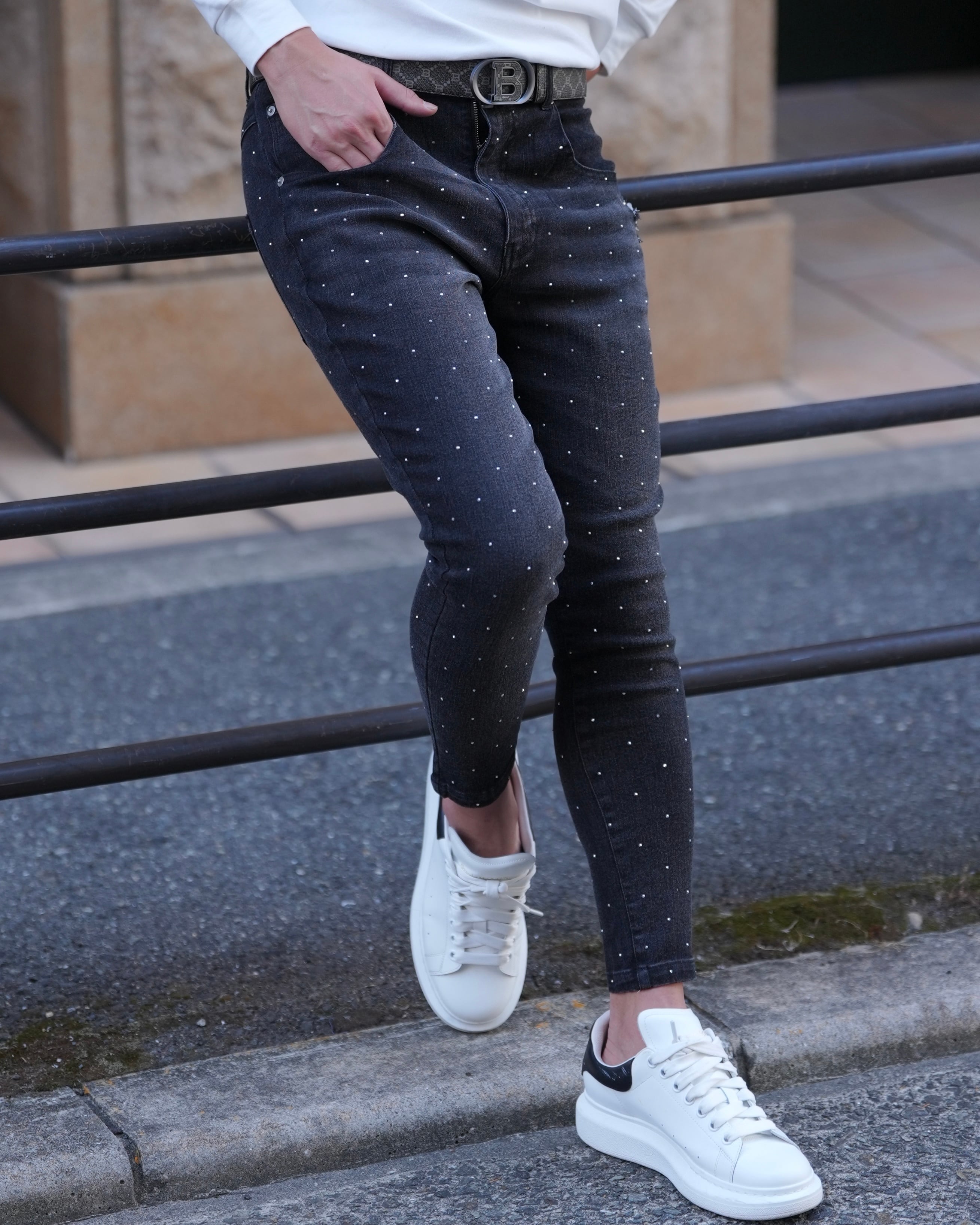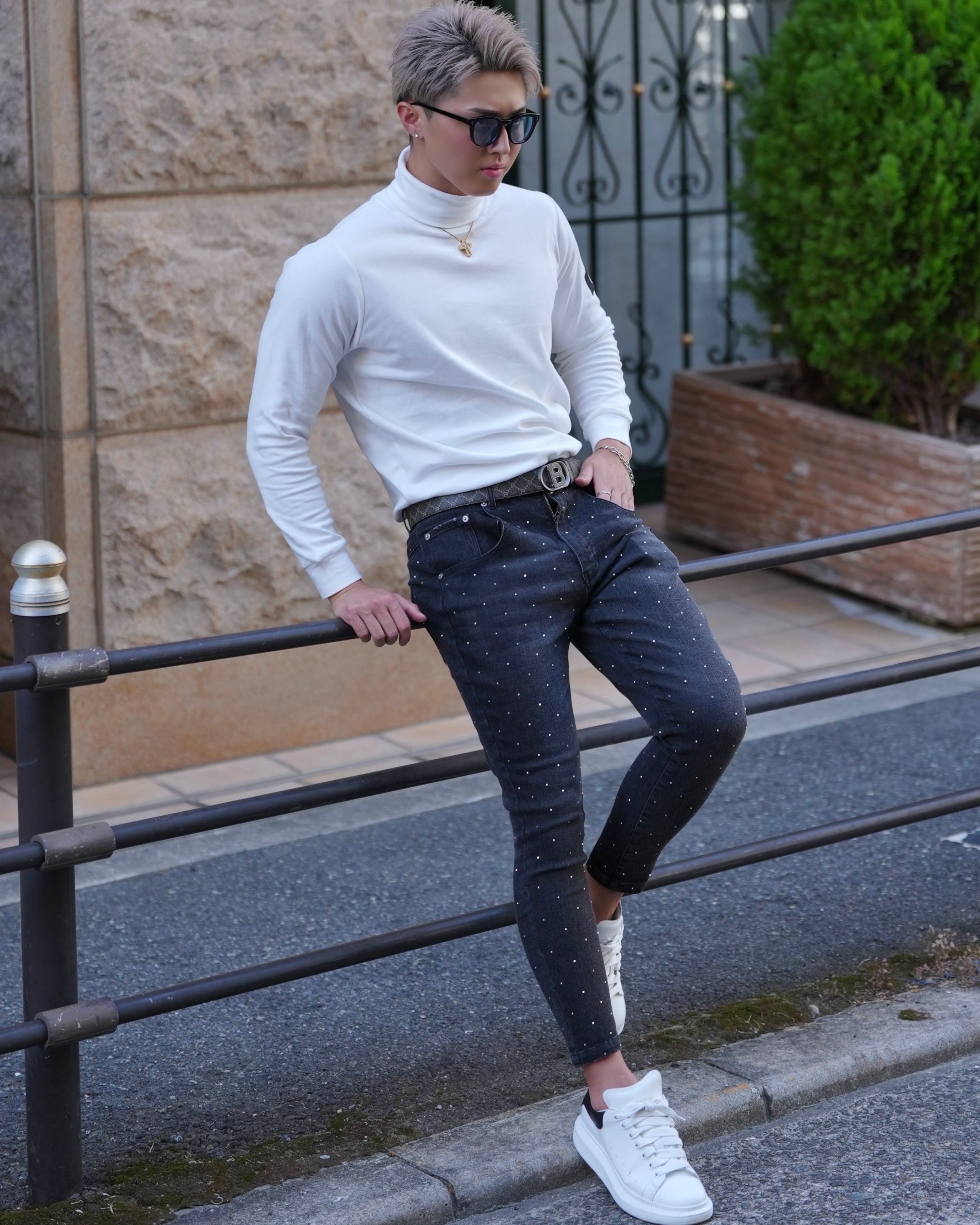 タイトなシルエットに無数のラインストーンを散りばめ、歩くたびに光を反射する最強の一本。