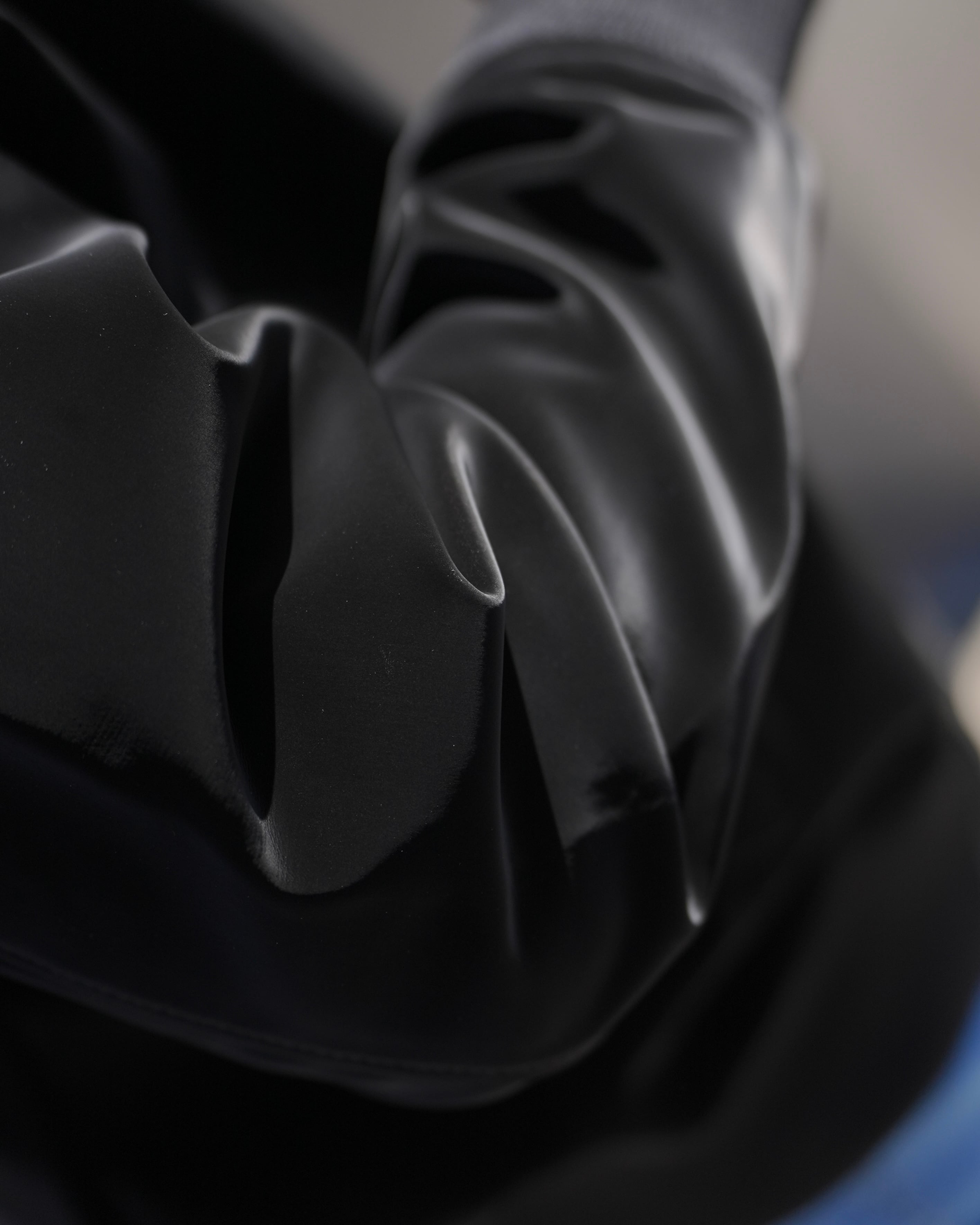 特殊なベロア素材を使用し艶が光を受けるたびに表情を変え、シンプルなブラックながら圧倒的な存在感を放つ。