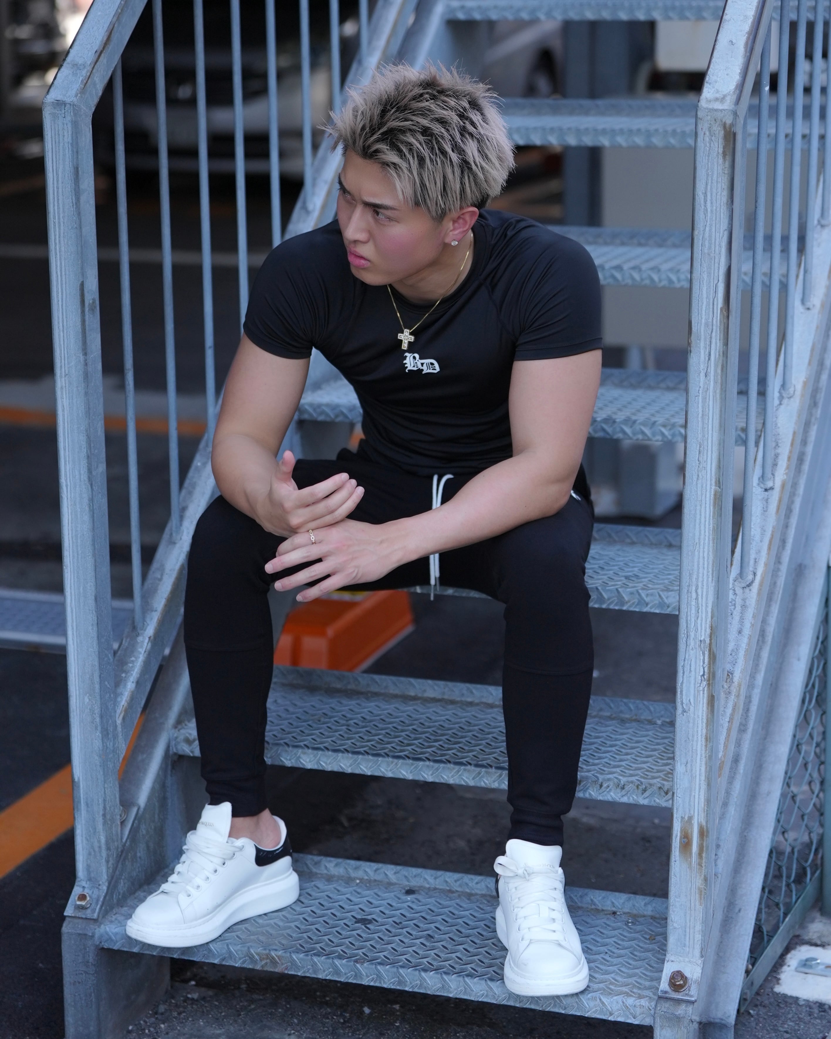 BELINDA代表TOMOYAが語るように、「BELINDAを着る男は、トレーニングすら魅せ場に変える」