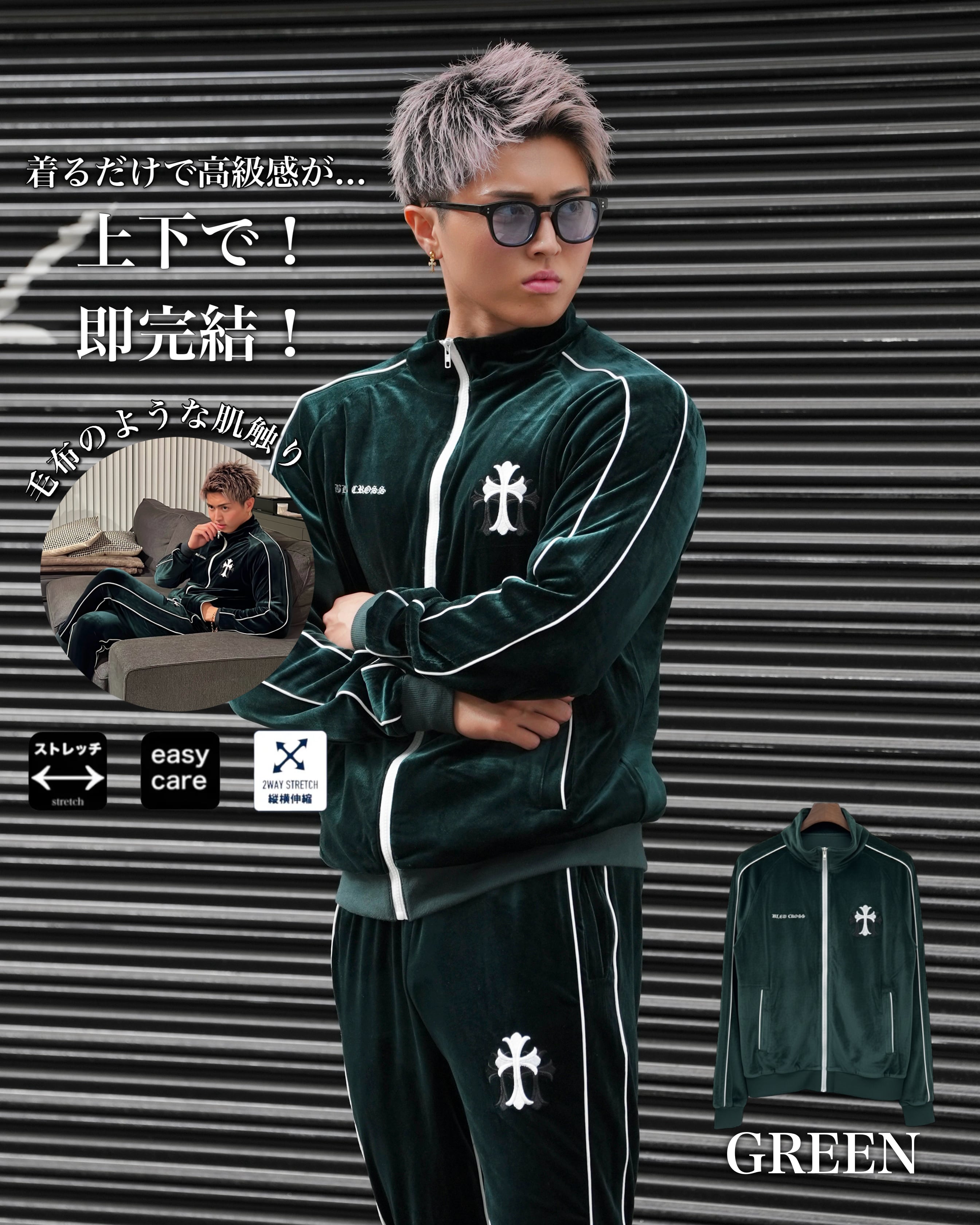 ● 光沢を放つ極上ベロア生地を採用し、着心地・高級感ともに圧倒的。