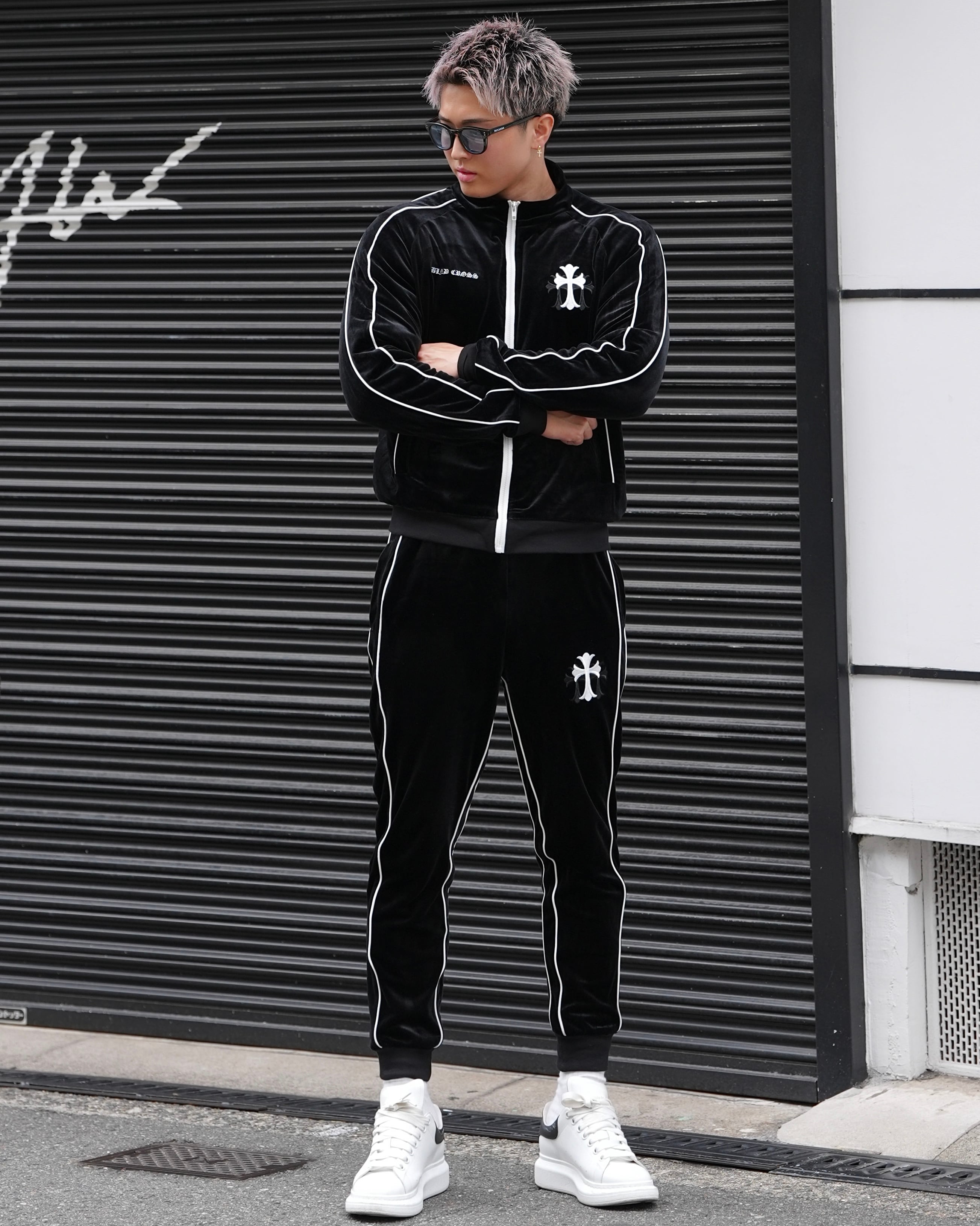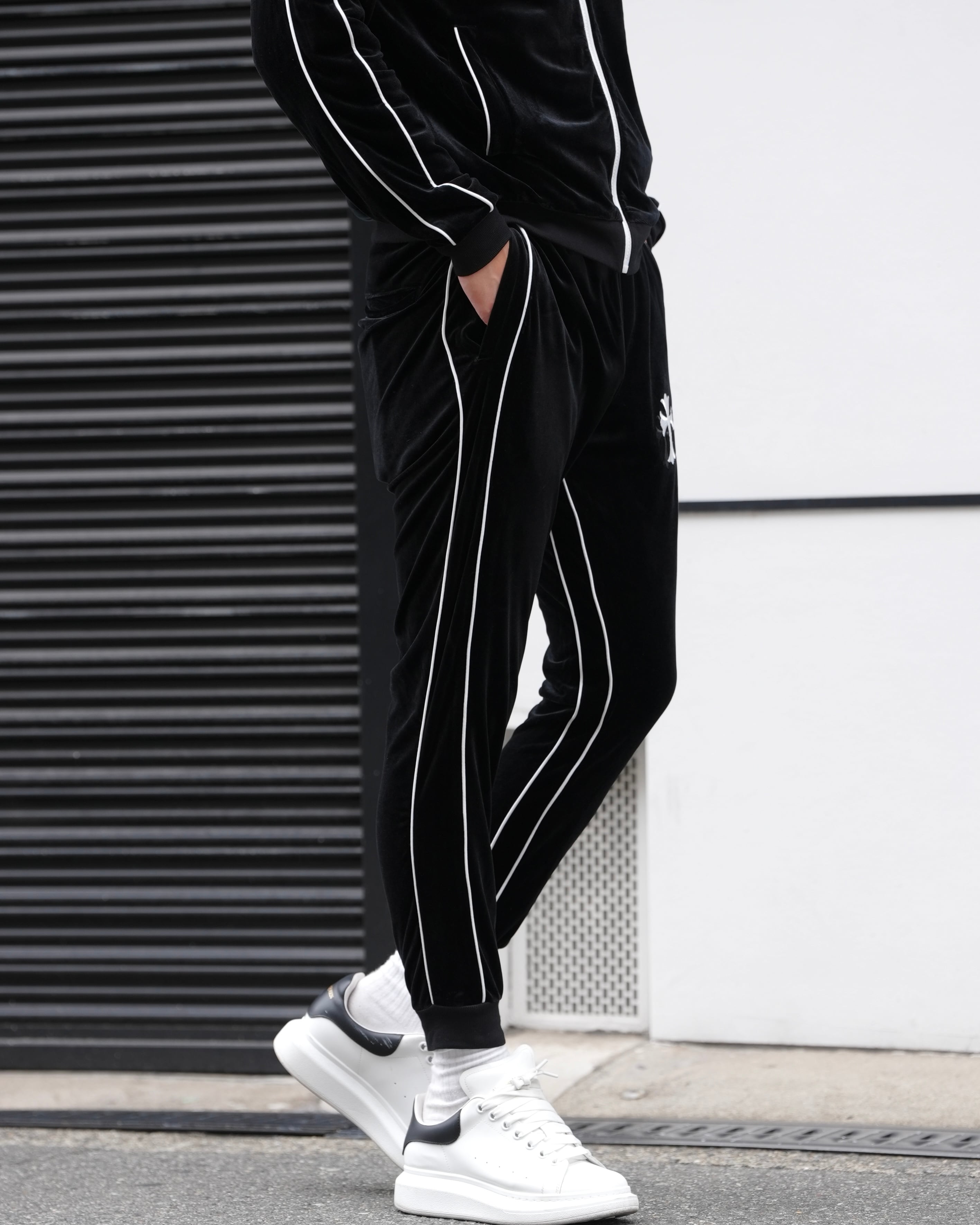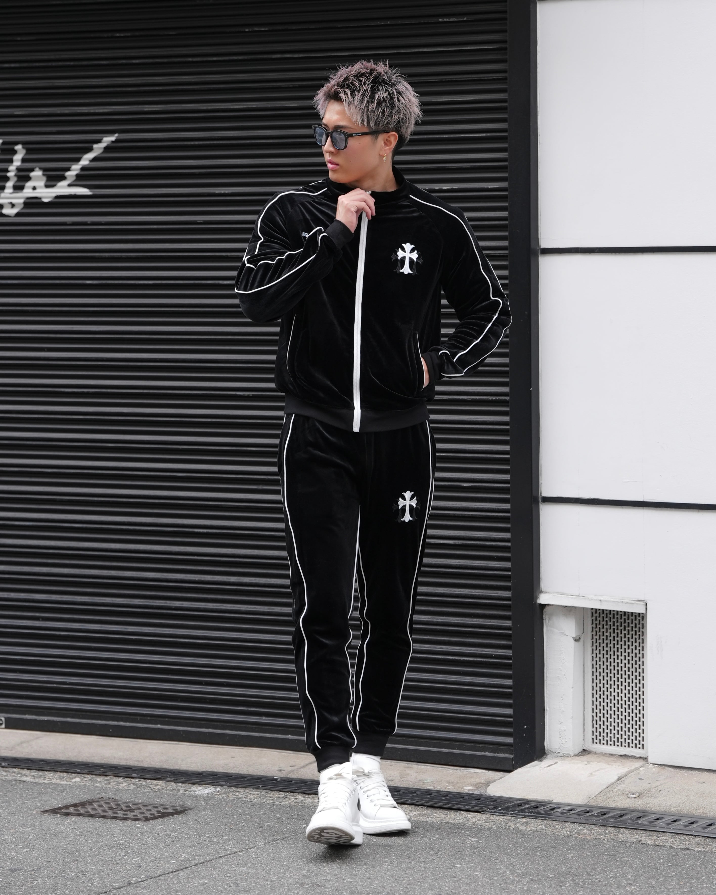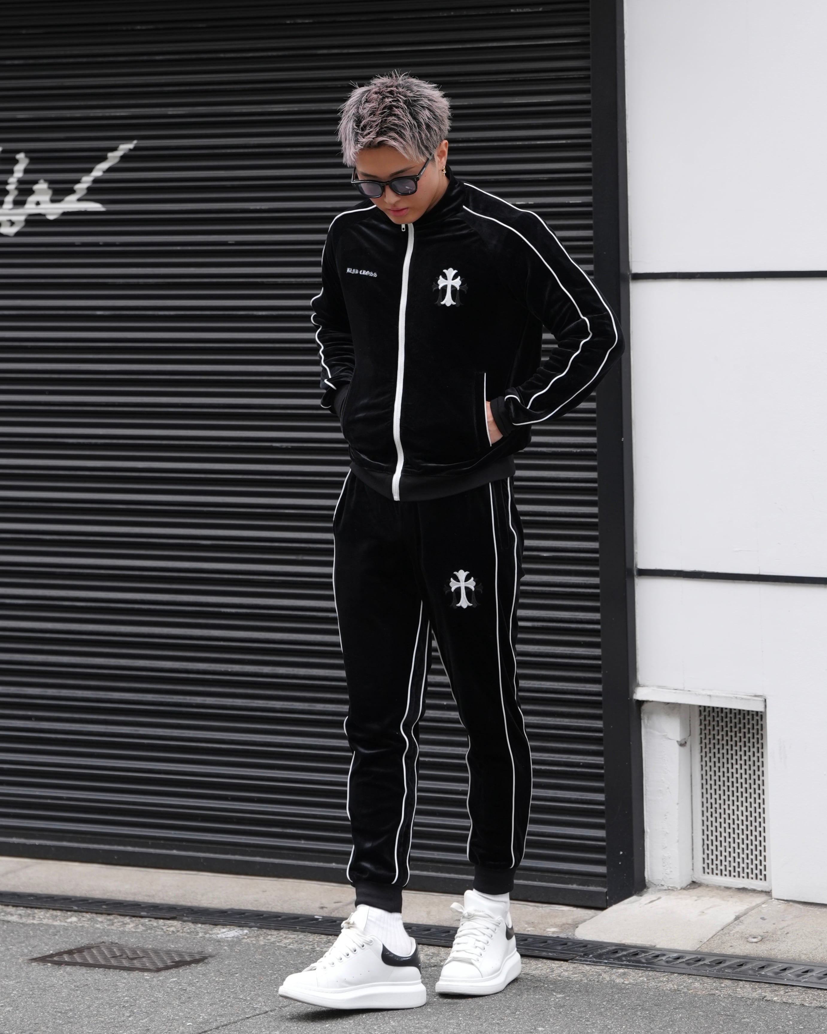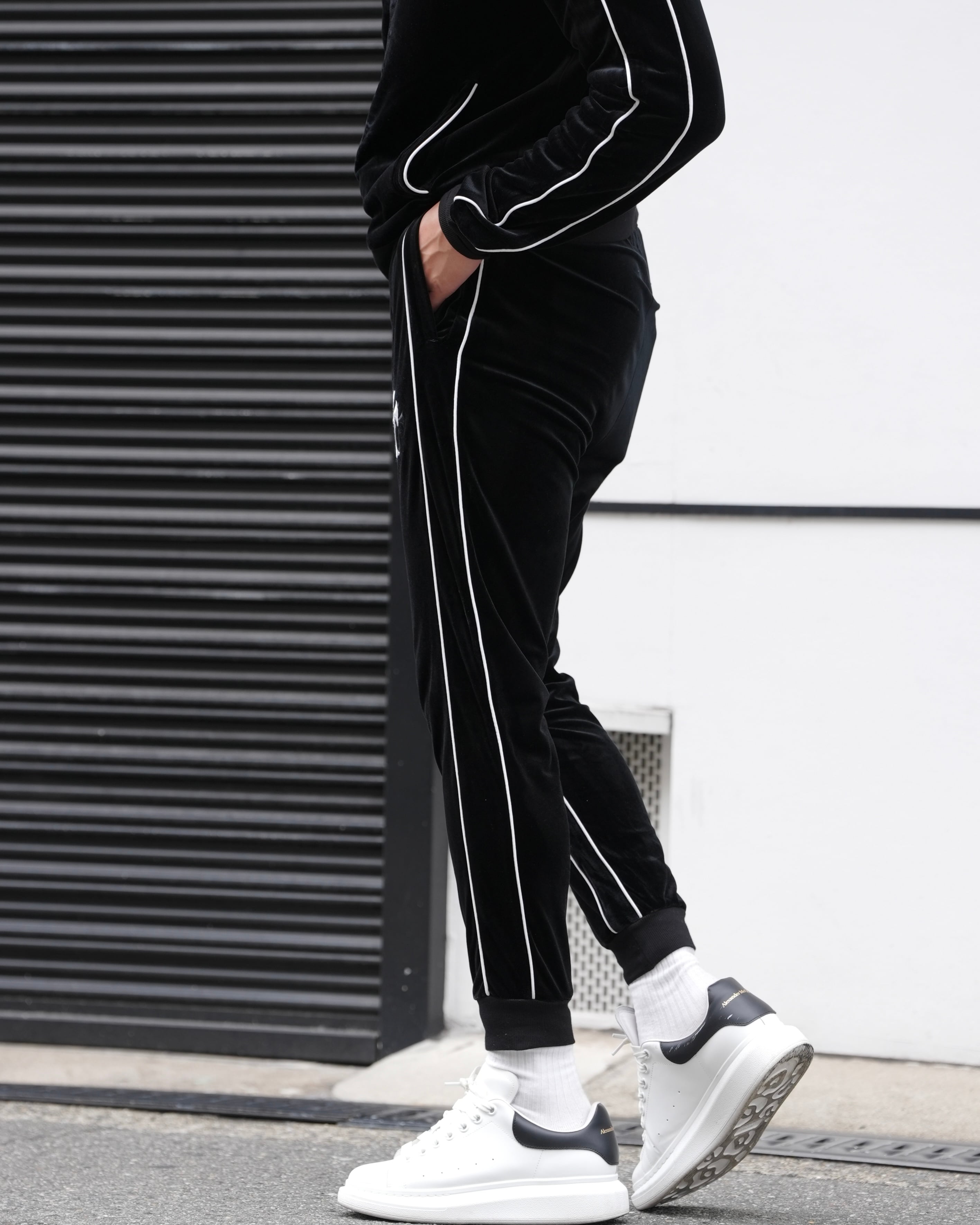 単品でも圧倒的に映えるトラックライン入りベロアパンツ。