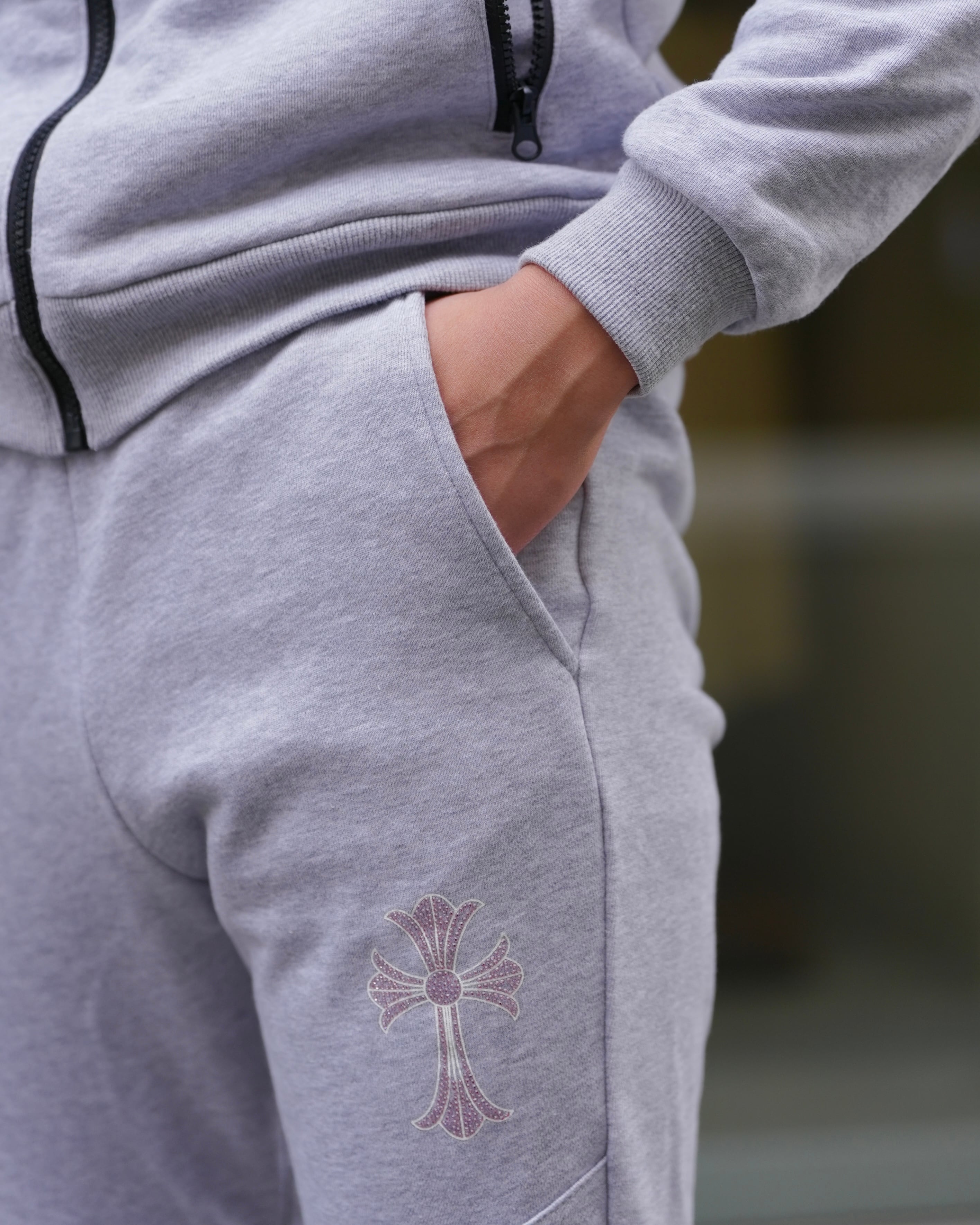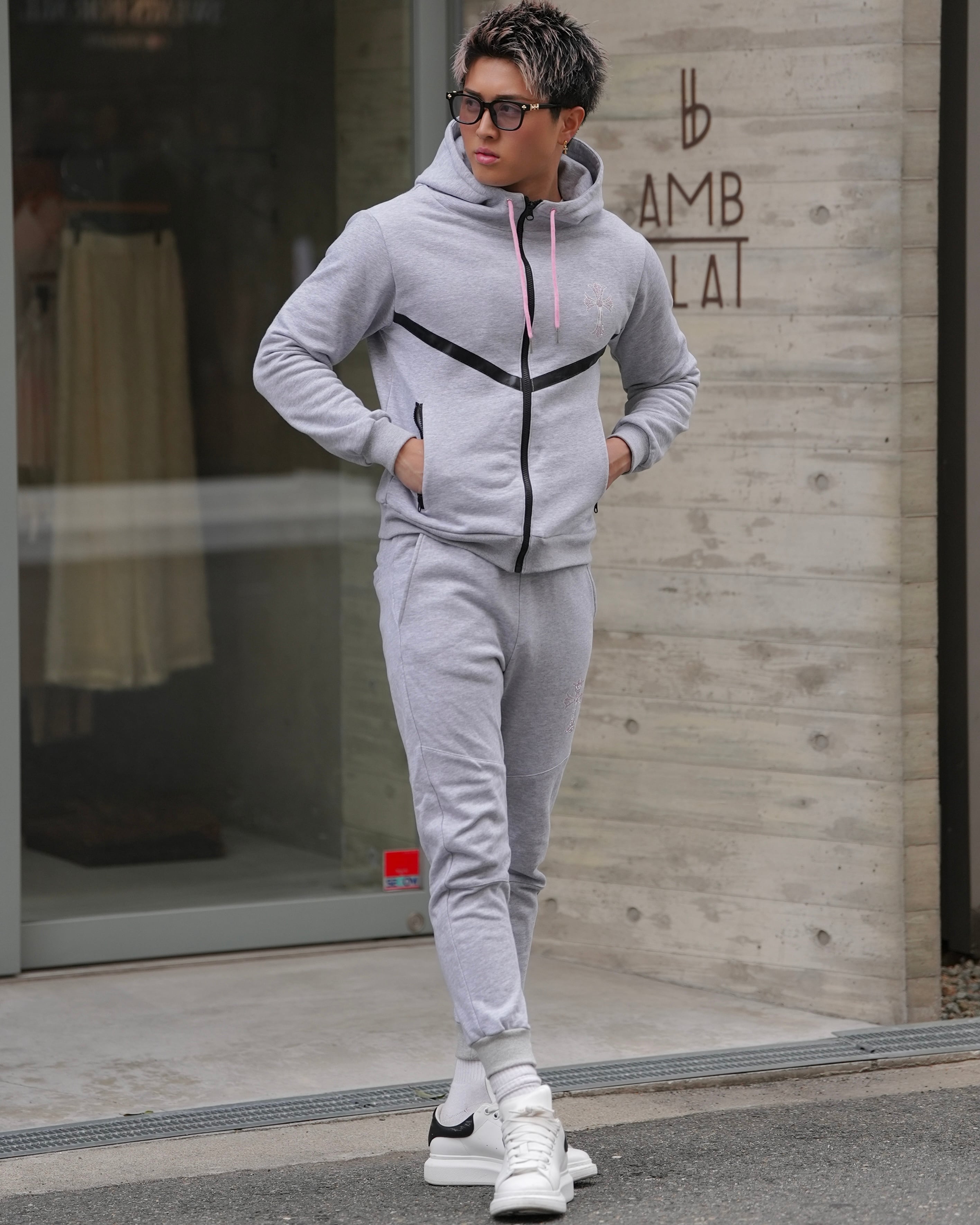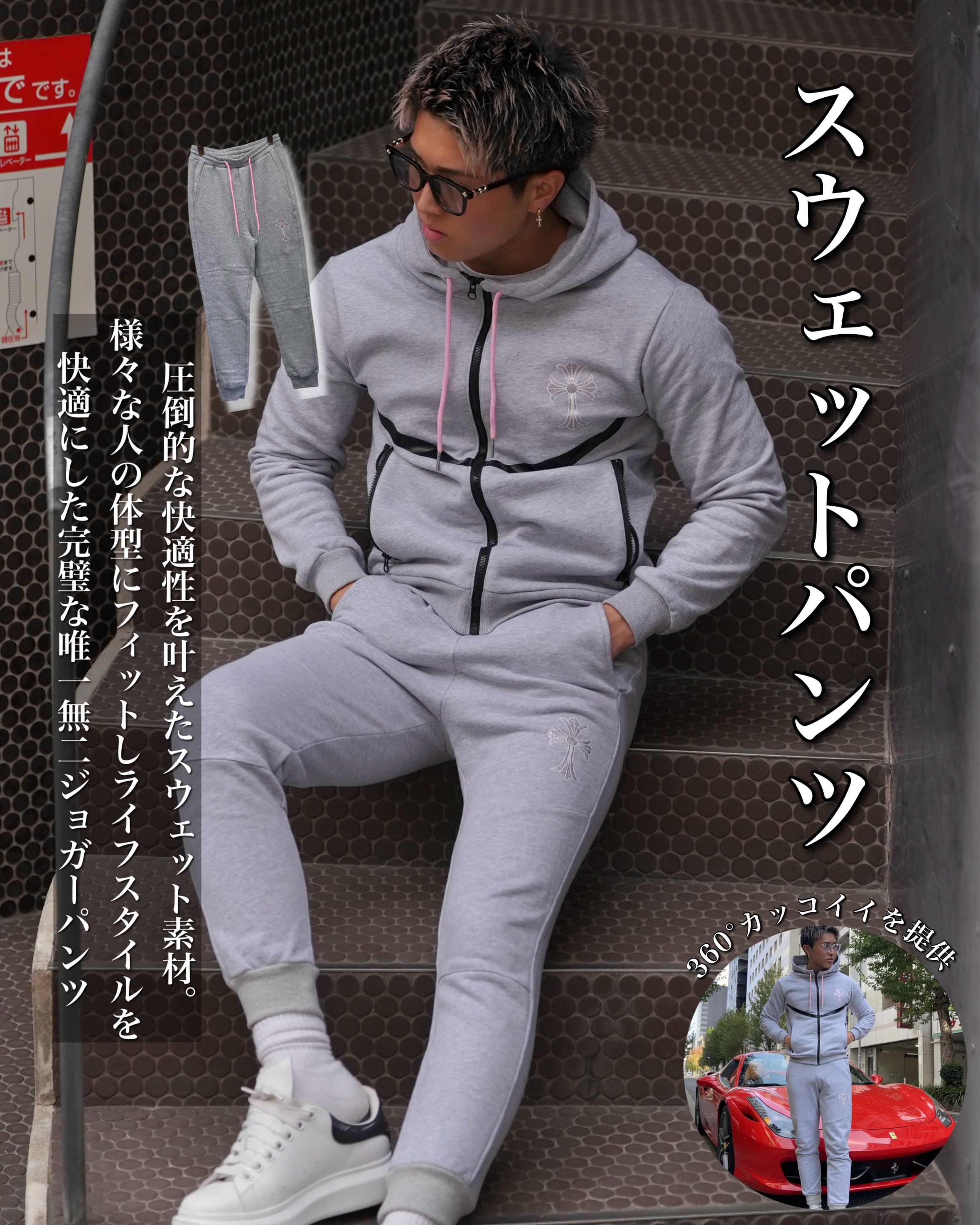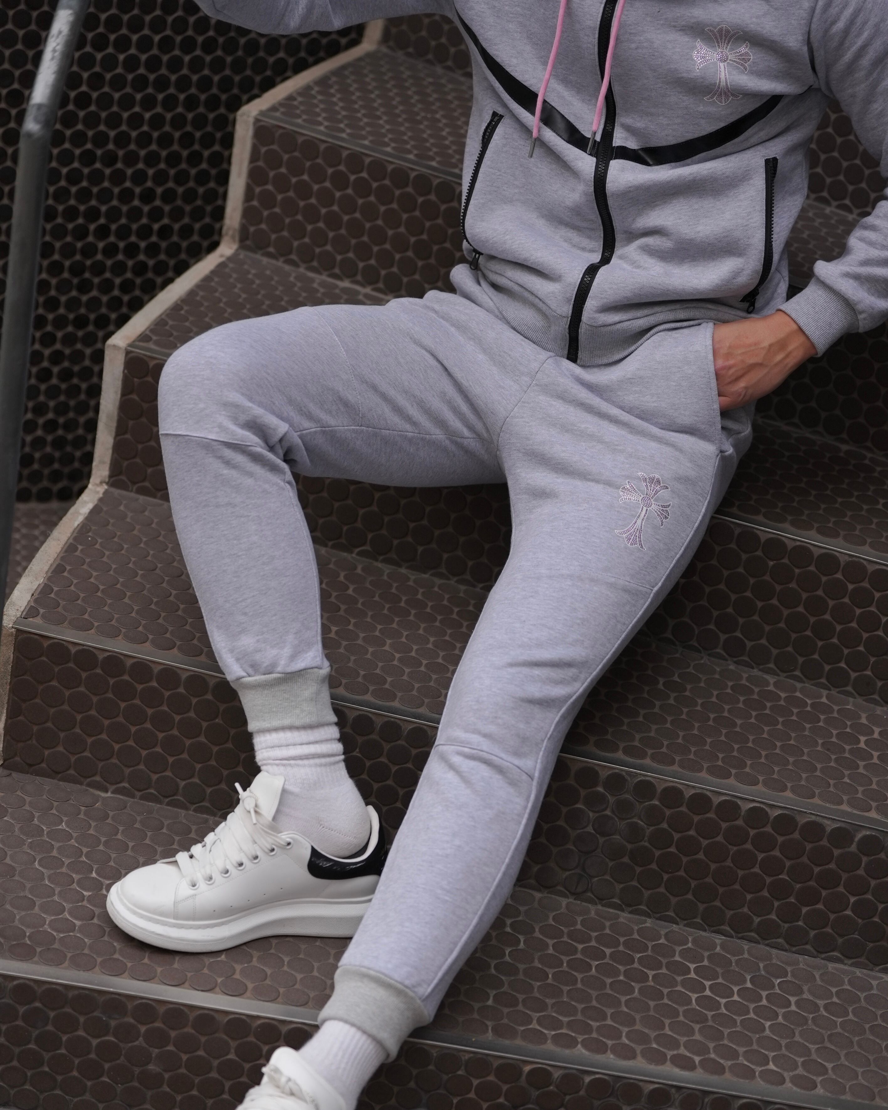 上質な素材にピンクストーンのロゴが輝くスウェットパンツ。