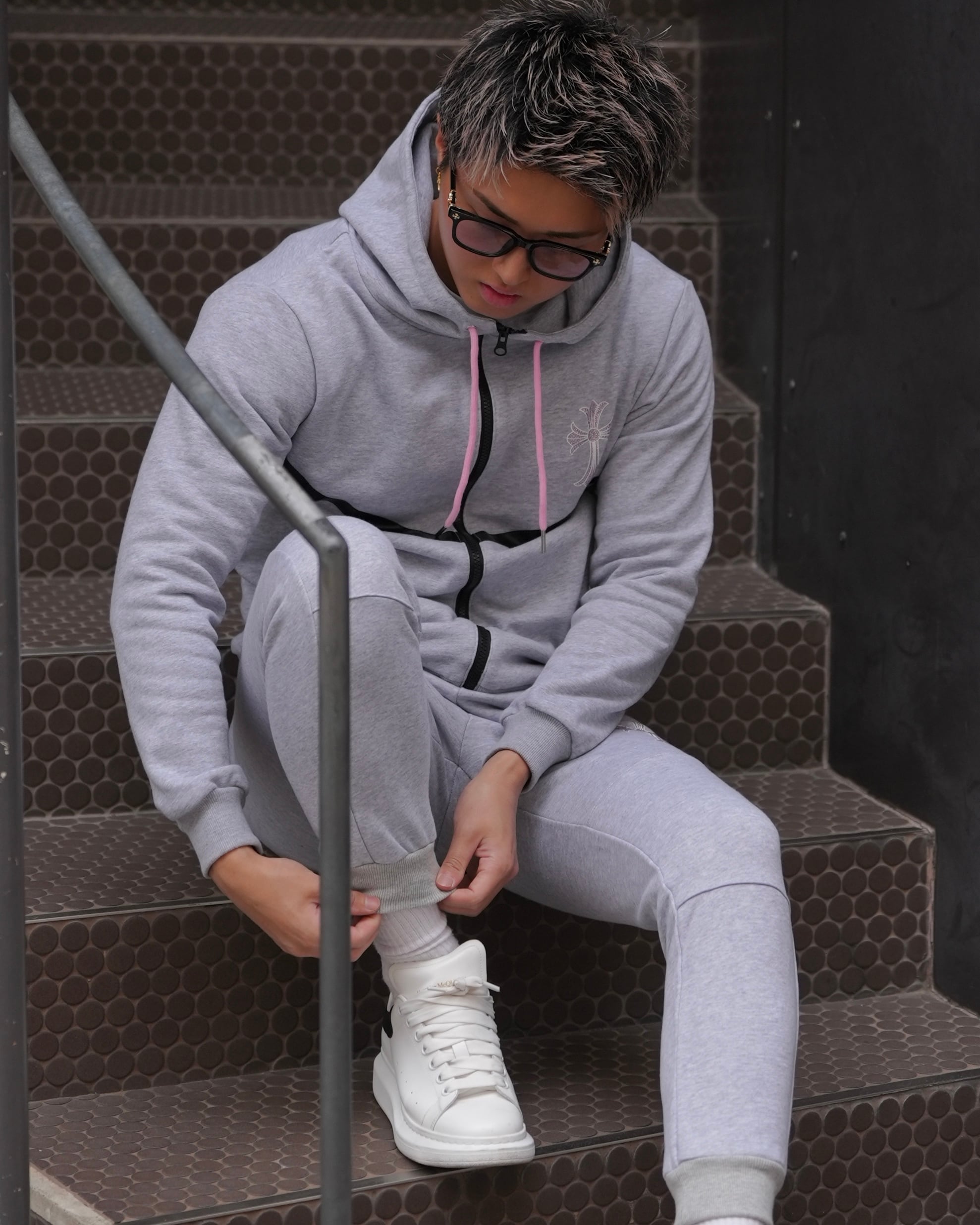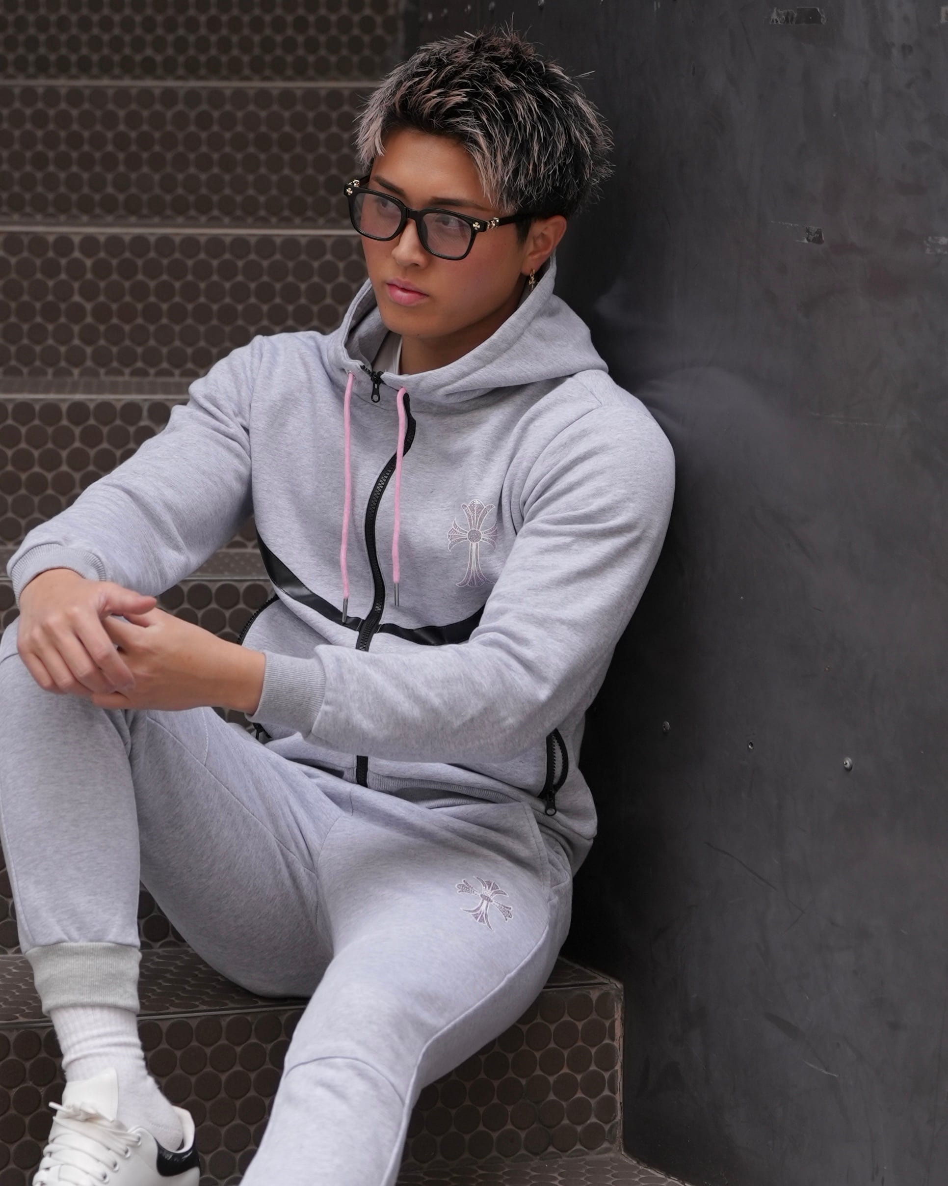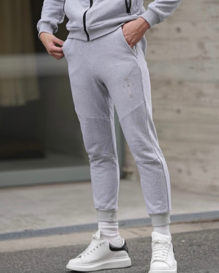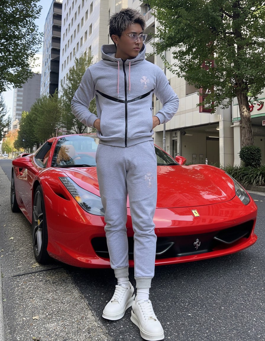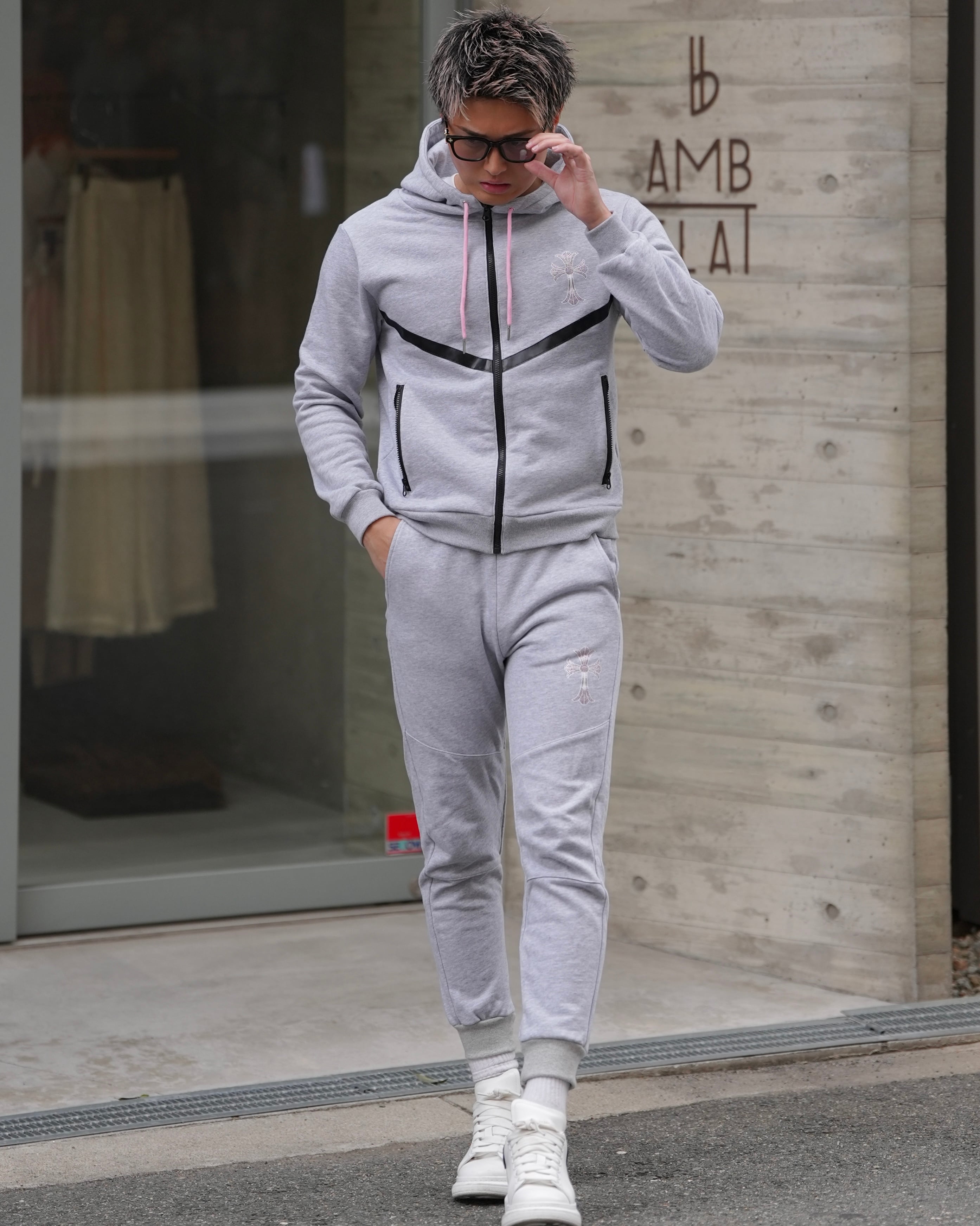 上質な素材にピンクストーンのロゴが輝くスウェットパンツ。