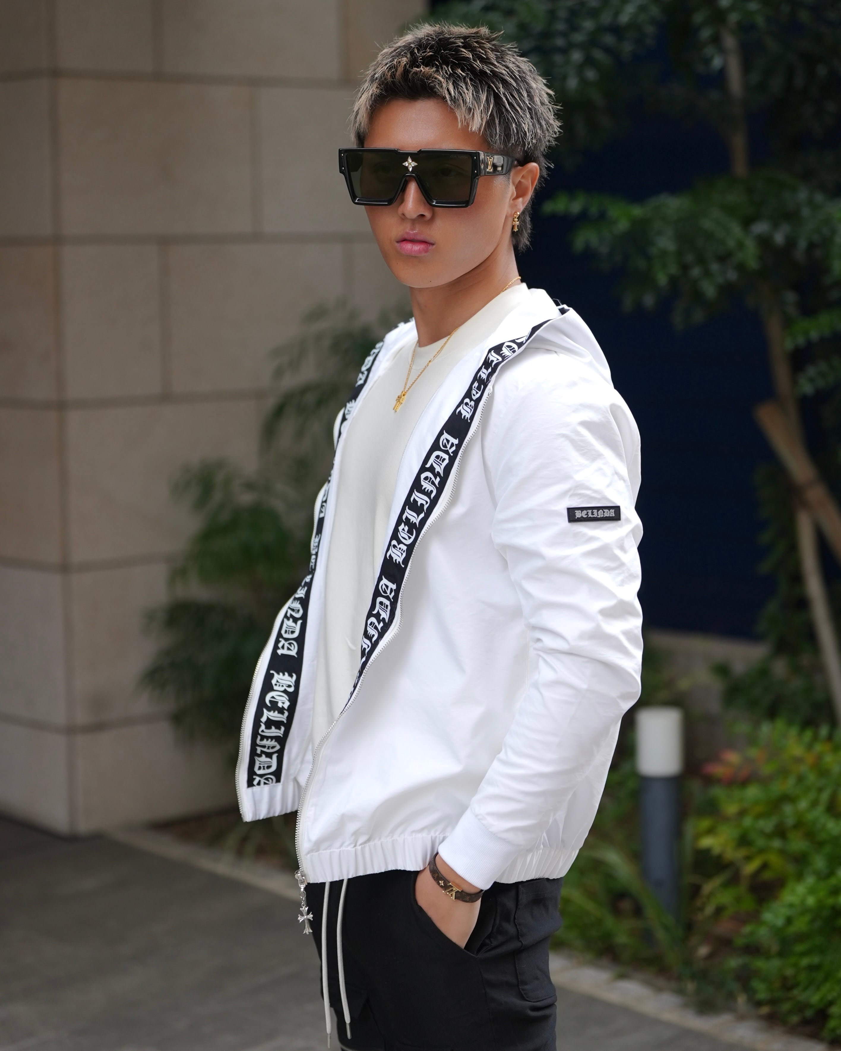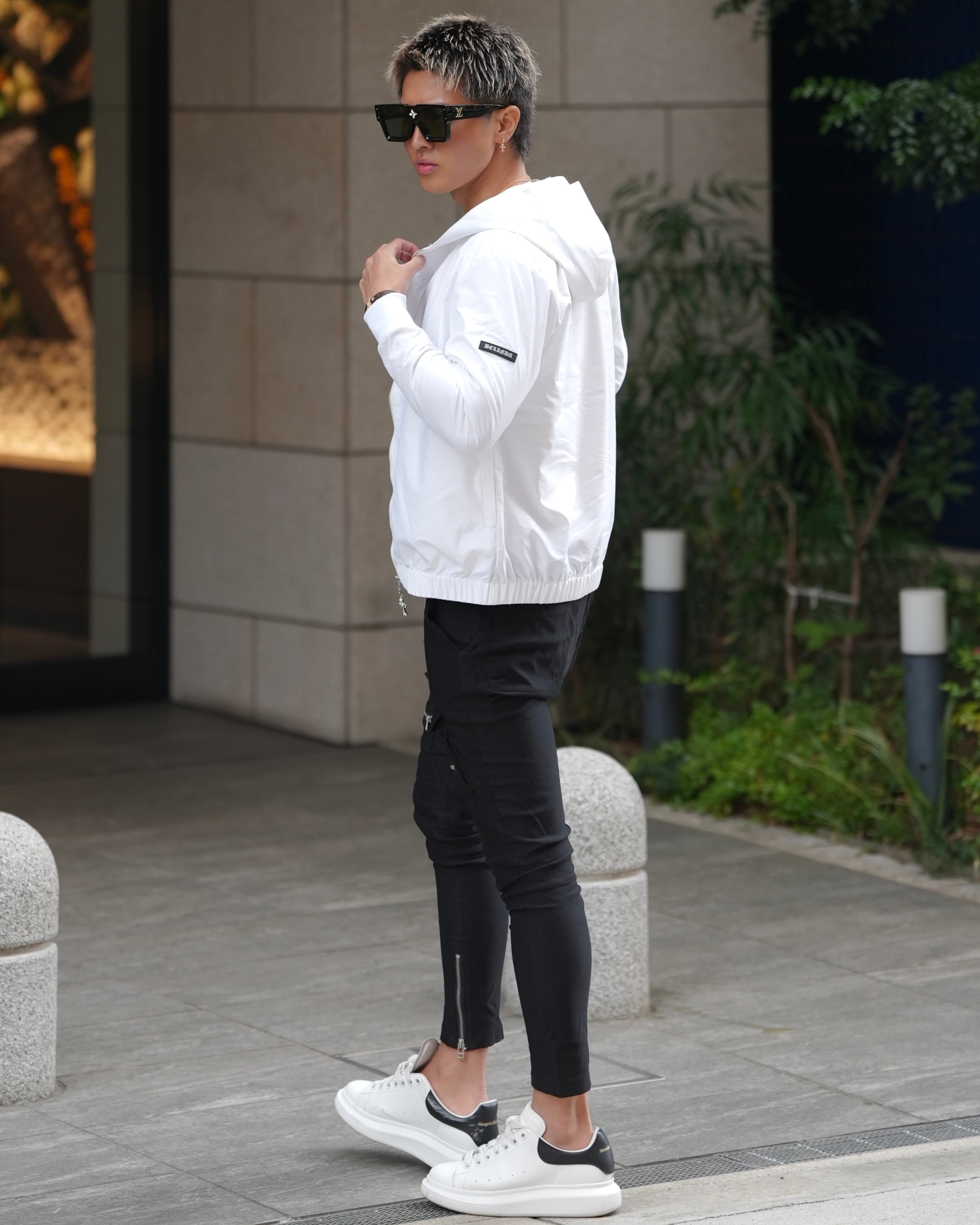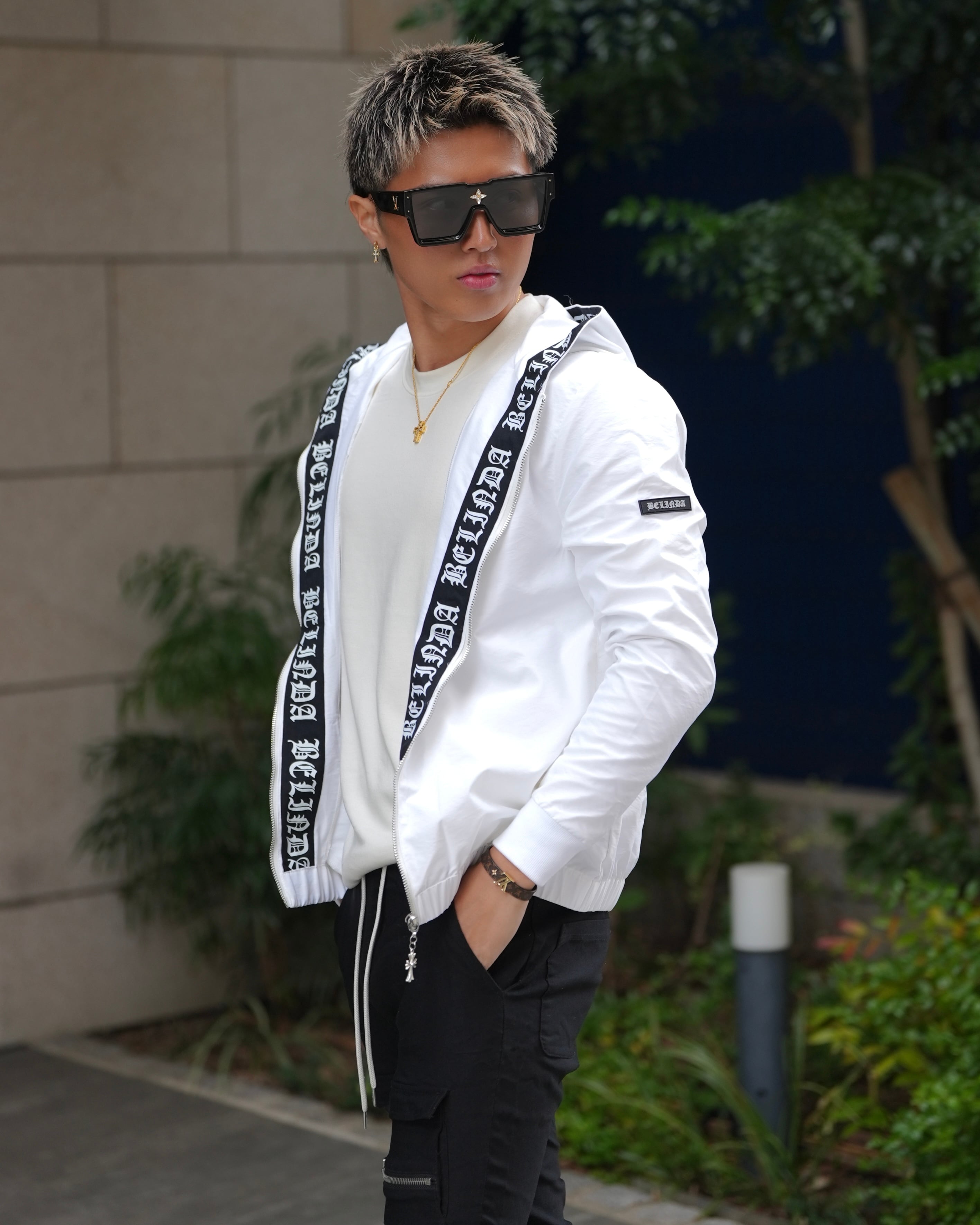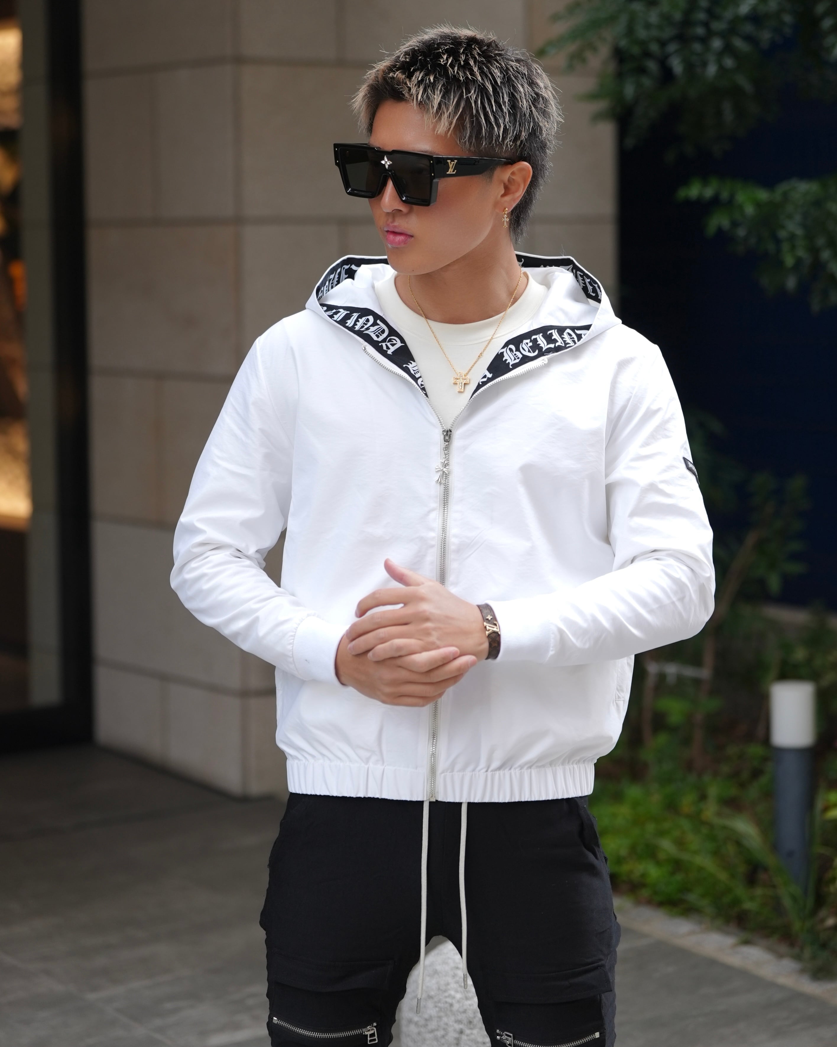 フードラインに大胆に配置した高級感あるブランドロゴ。