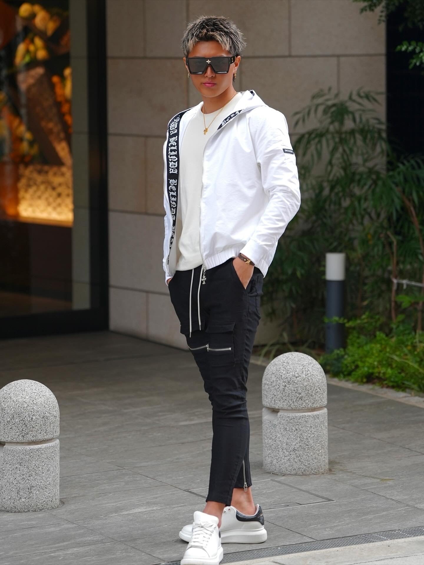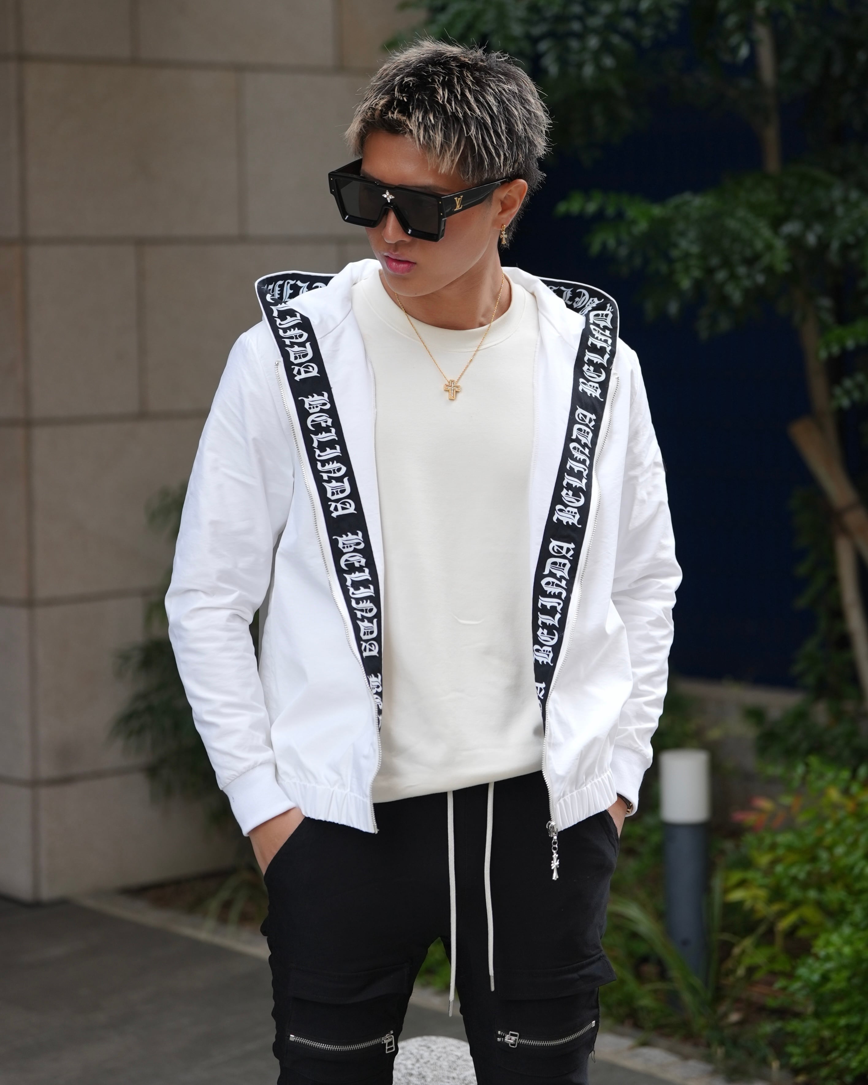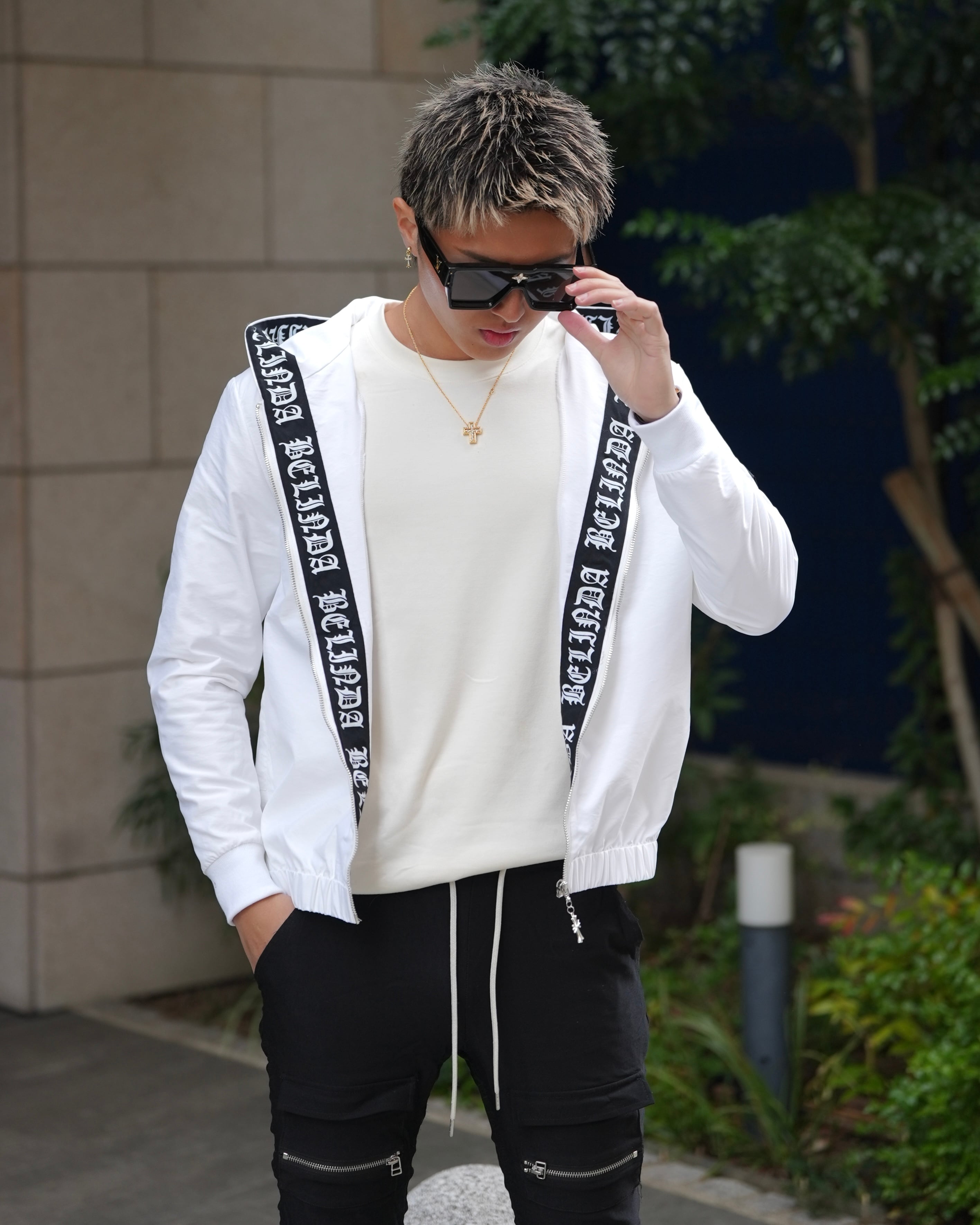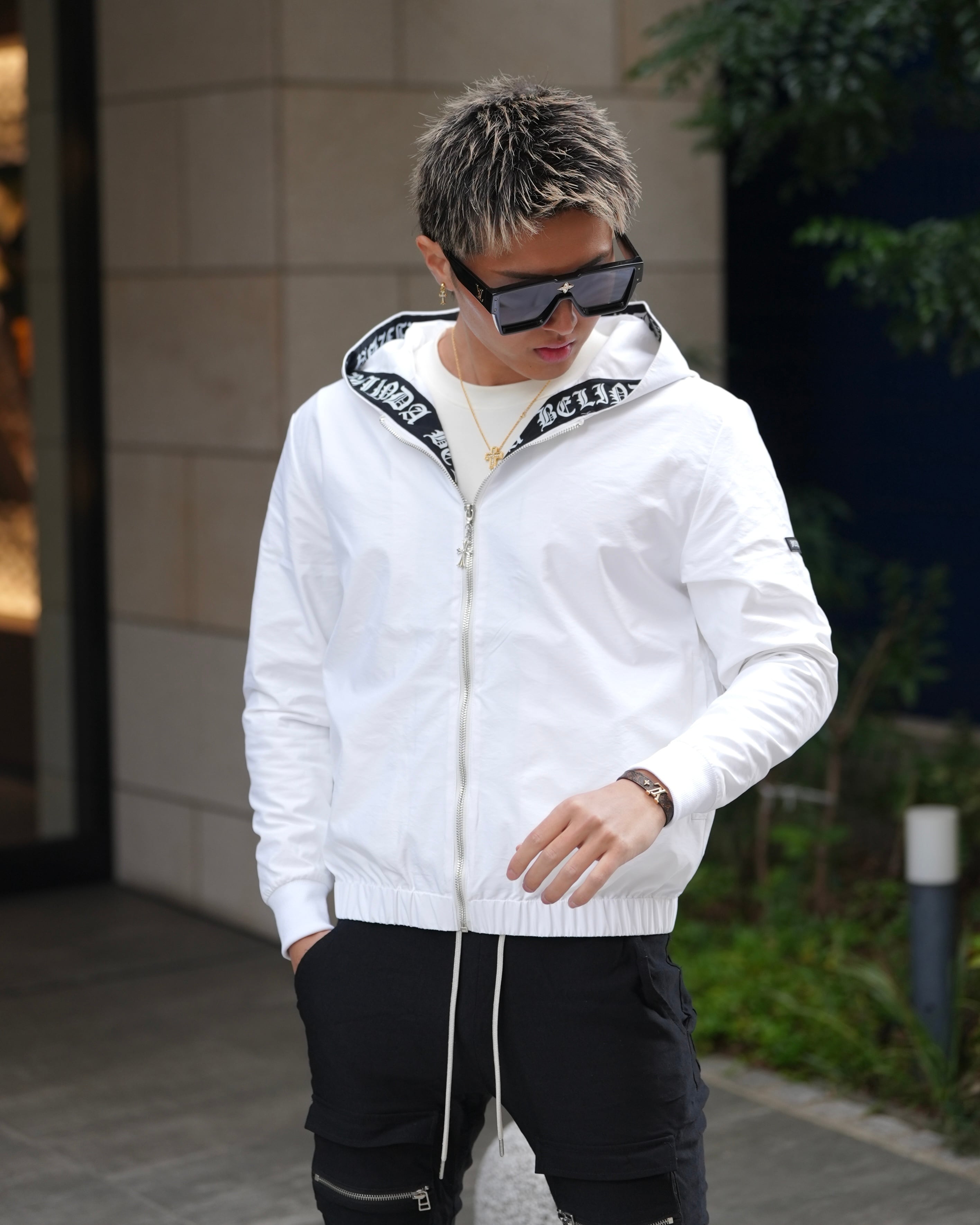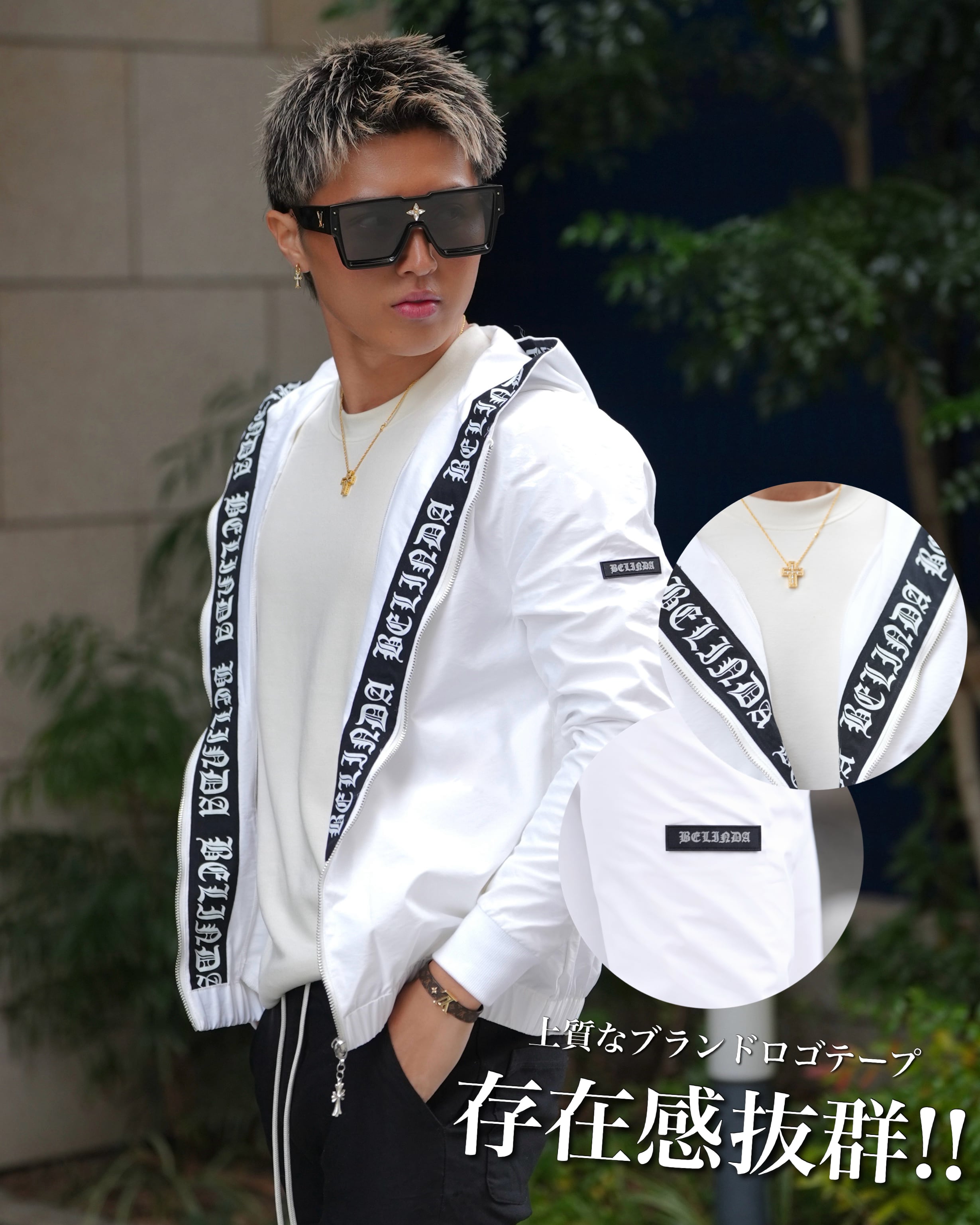 ・フード内側に大胆なブランドロゴテープ